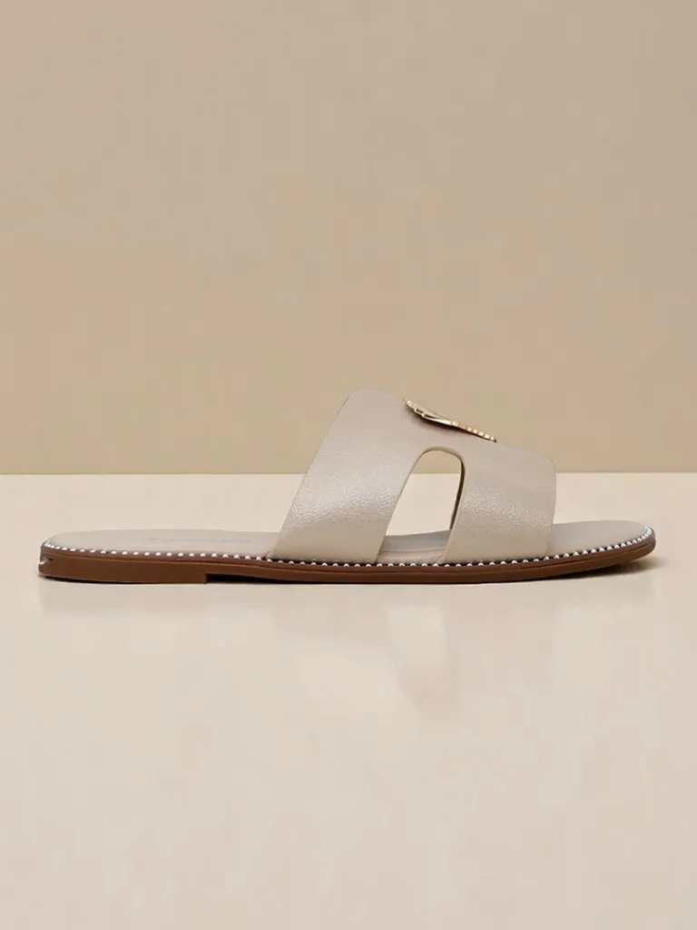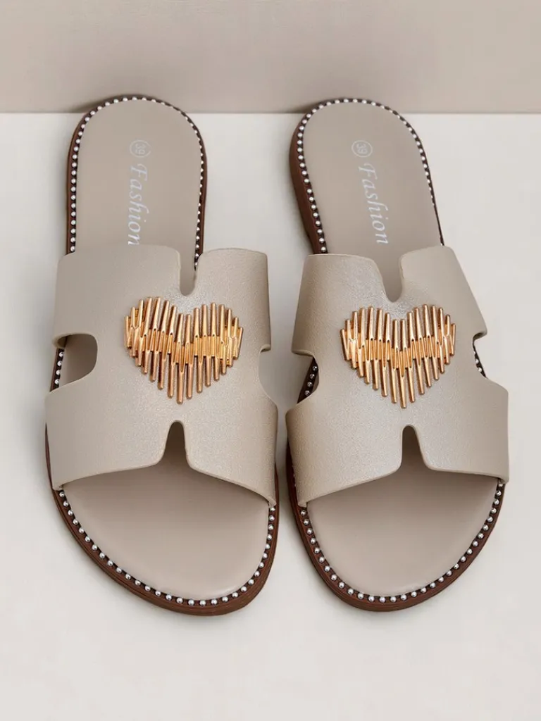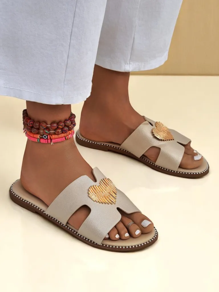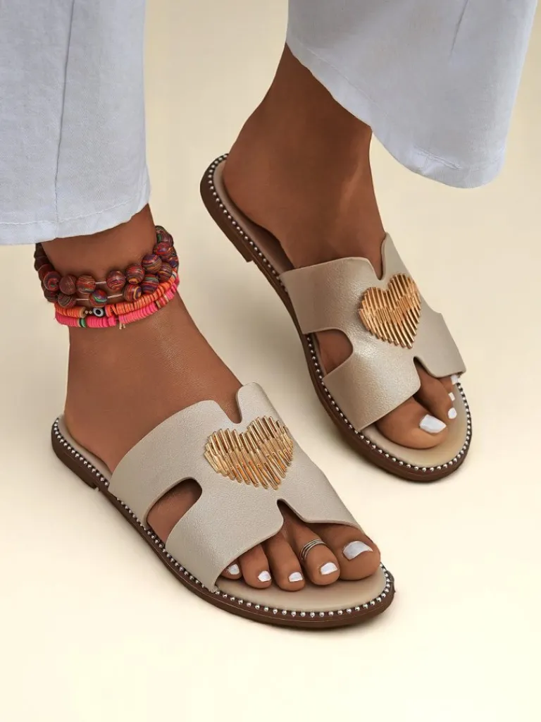 - Klapki z eko skóry z płaską podeszwą i złotą ozdobą w kształcie serca. Styl i wygoda w jednym — idealne na lato, spacer po mieście i lekkie, kobiece stylizacje.