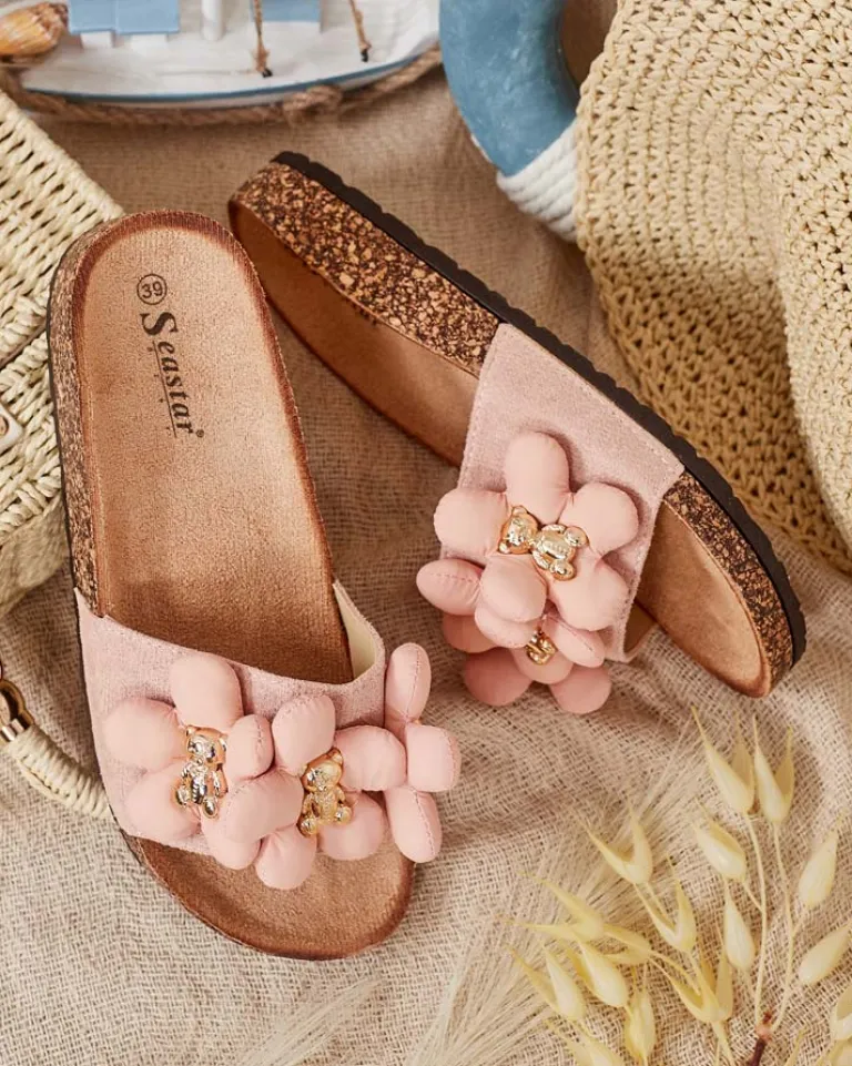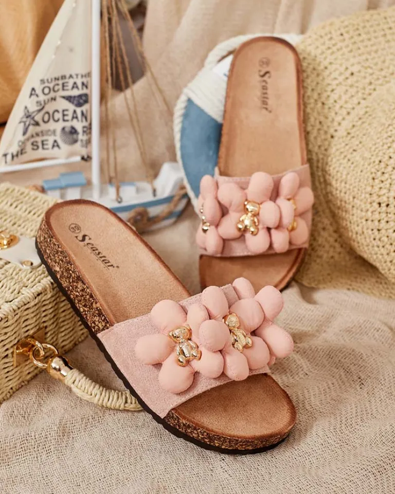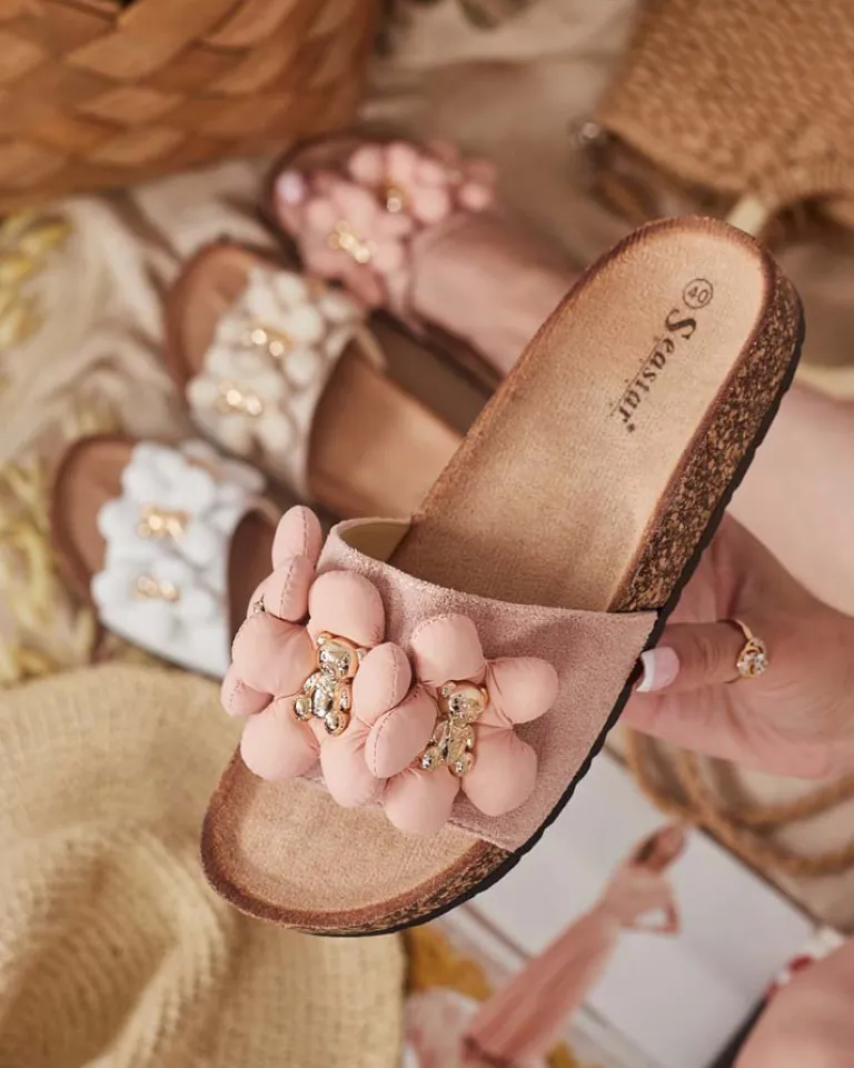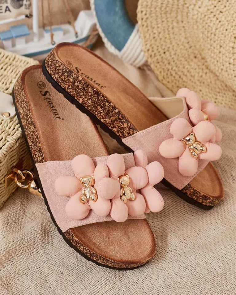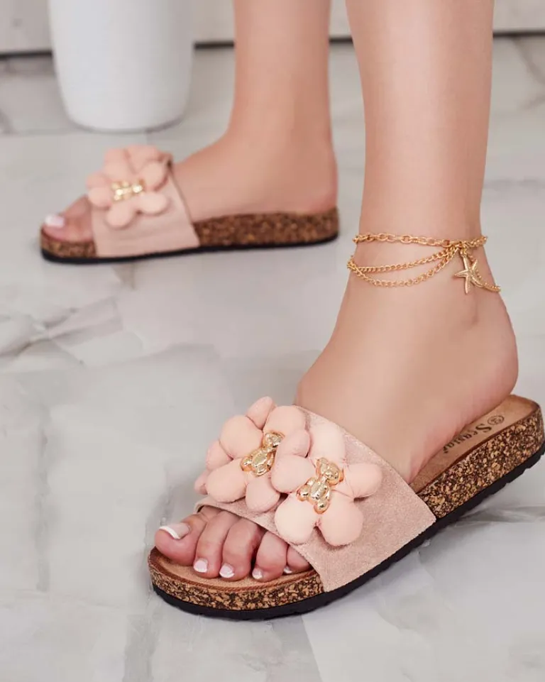 - Płaskie klapki z ozdobami na paseczku to wyjątkowe połączenie stylu i wygody. Cholewka z eko zamszu i wkładka z eko skóry zamszowej nadaje im elegancki wygląd. Podeszwa ozdobiona tworzywem przypominającym korek – dodaje im oryginalności!