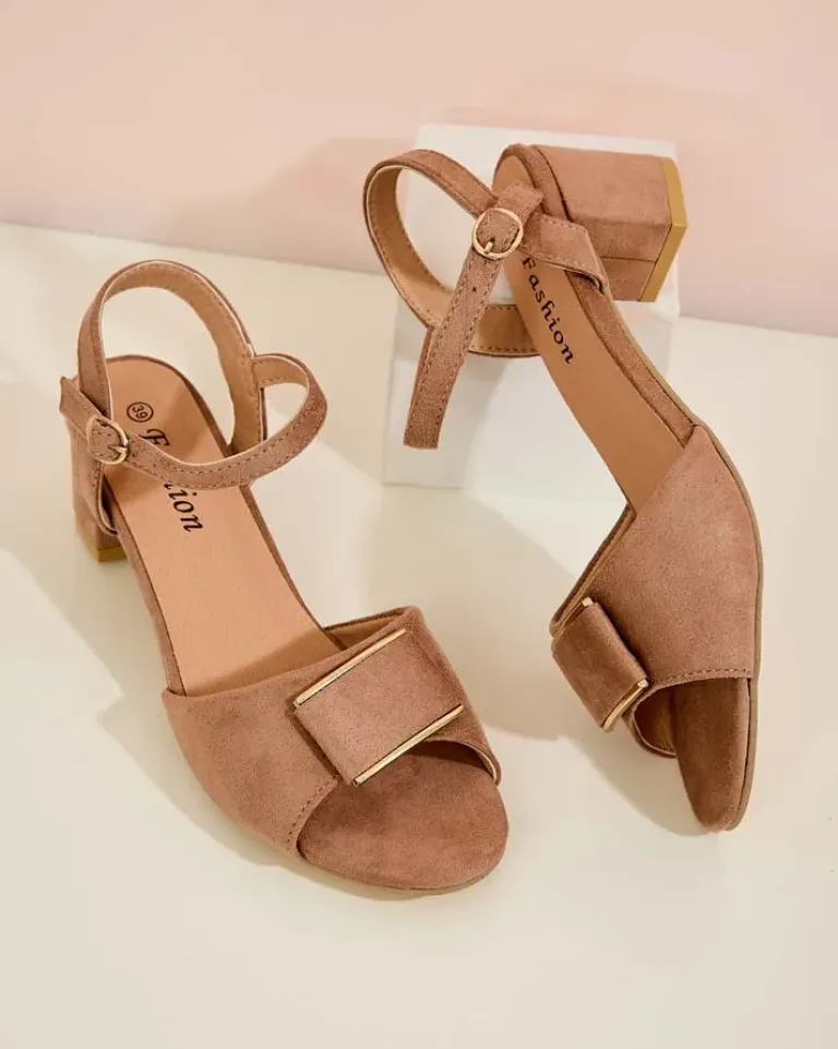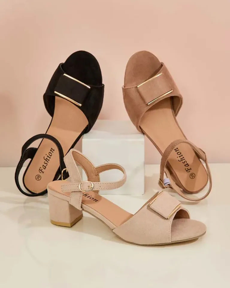- Damskie sandałki na słupku – to idealny pomysł na gorące letnie dni. Model wykonany ze skóry ekologicznej zamszowej i eko skórzanej wkładki. Obuwie zapinane na sprzączkę. Połączenie stylu i wygody!