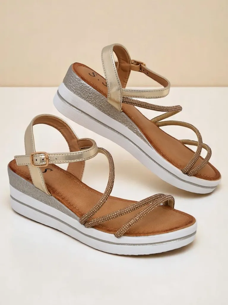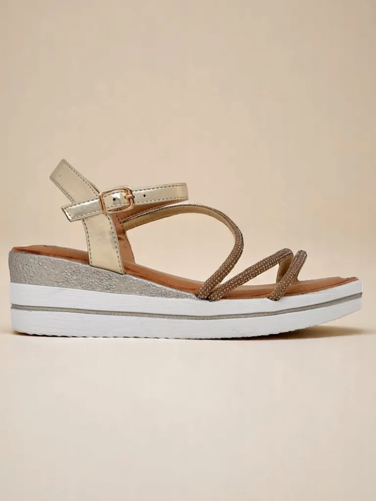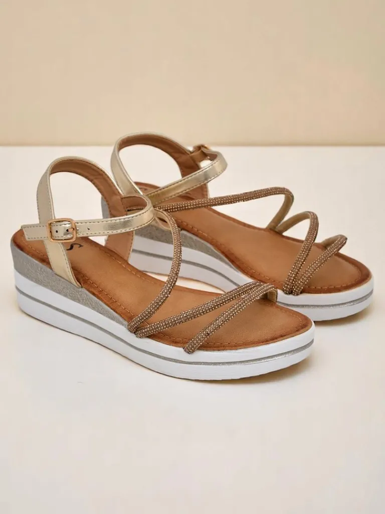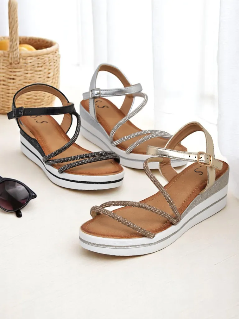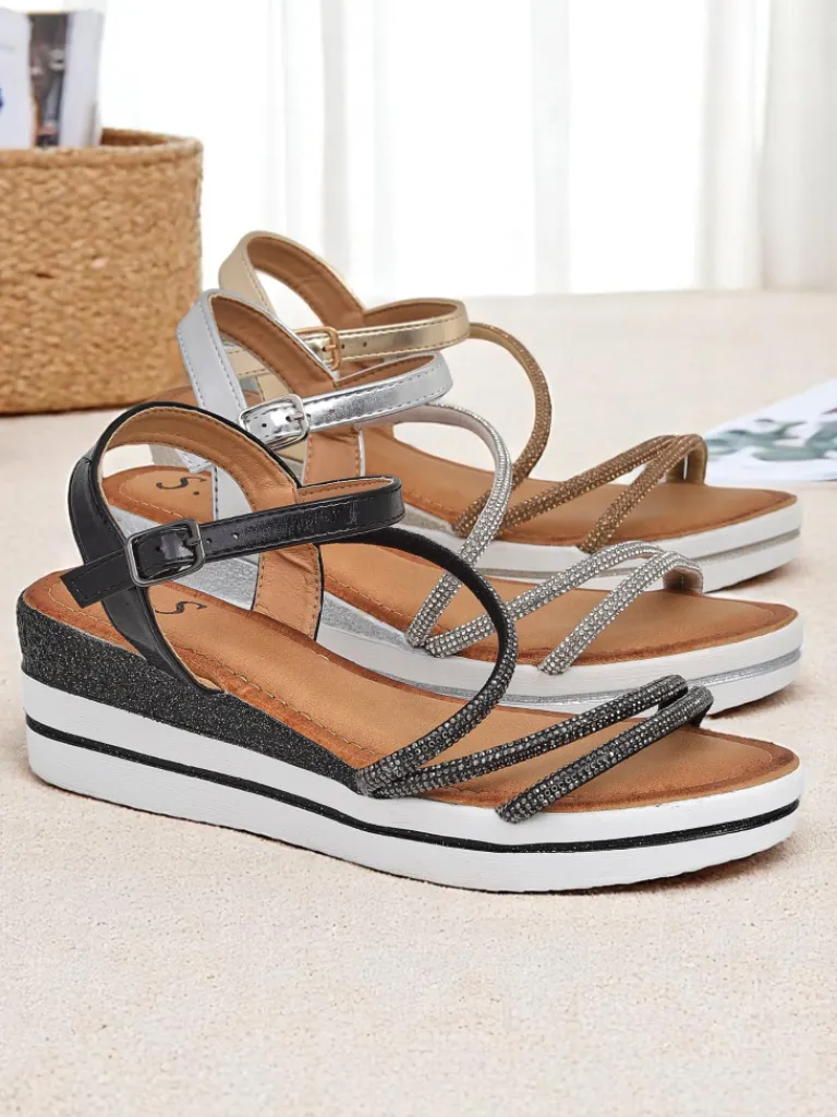 - Odkryj elegancję z tymi sandałami. Zjawiskowe na koturnie, ozdobione błyszczącymi cyrkoniami, idealnie podkreślają letni blask. Połączenie komfortu i luksusowego wyglądu – doskonałe na każdą wyjątkową okazję!