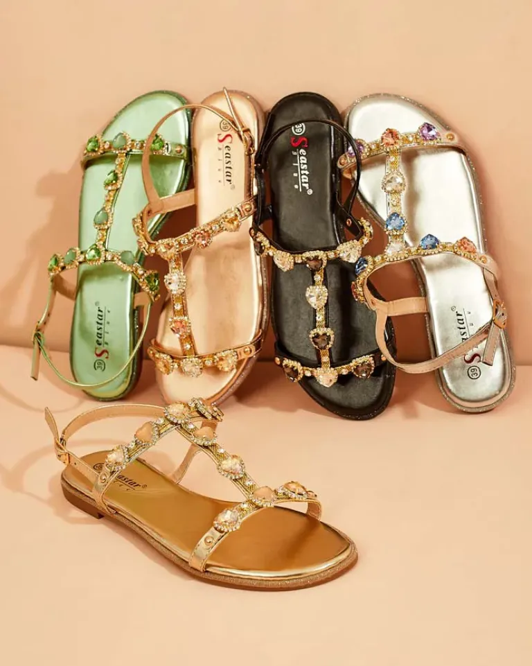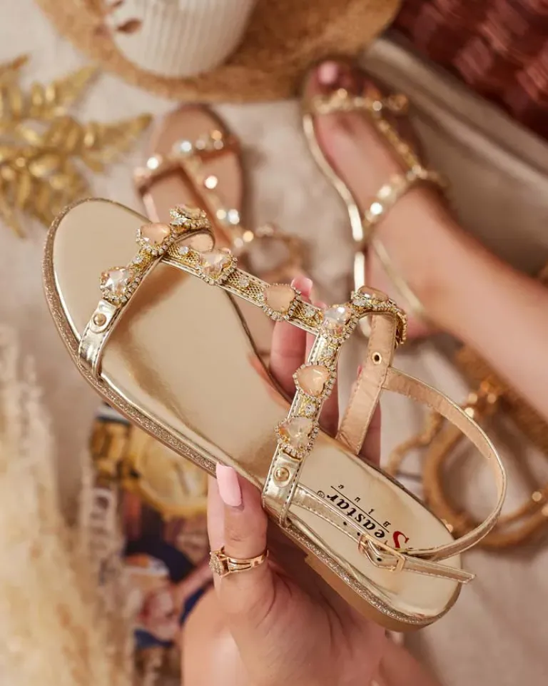 - Damskie sandałki na płaskiej podeszwie – to idealny pomysł na gorące letnie dni. Model całościowo wykonany ze skóry ekologicznej. Cholewka udekorowana ozdobnymi cyrkoniami.