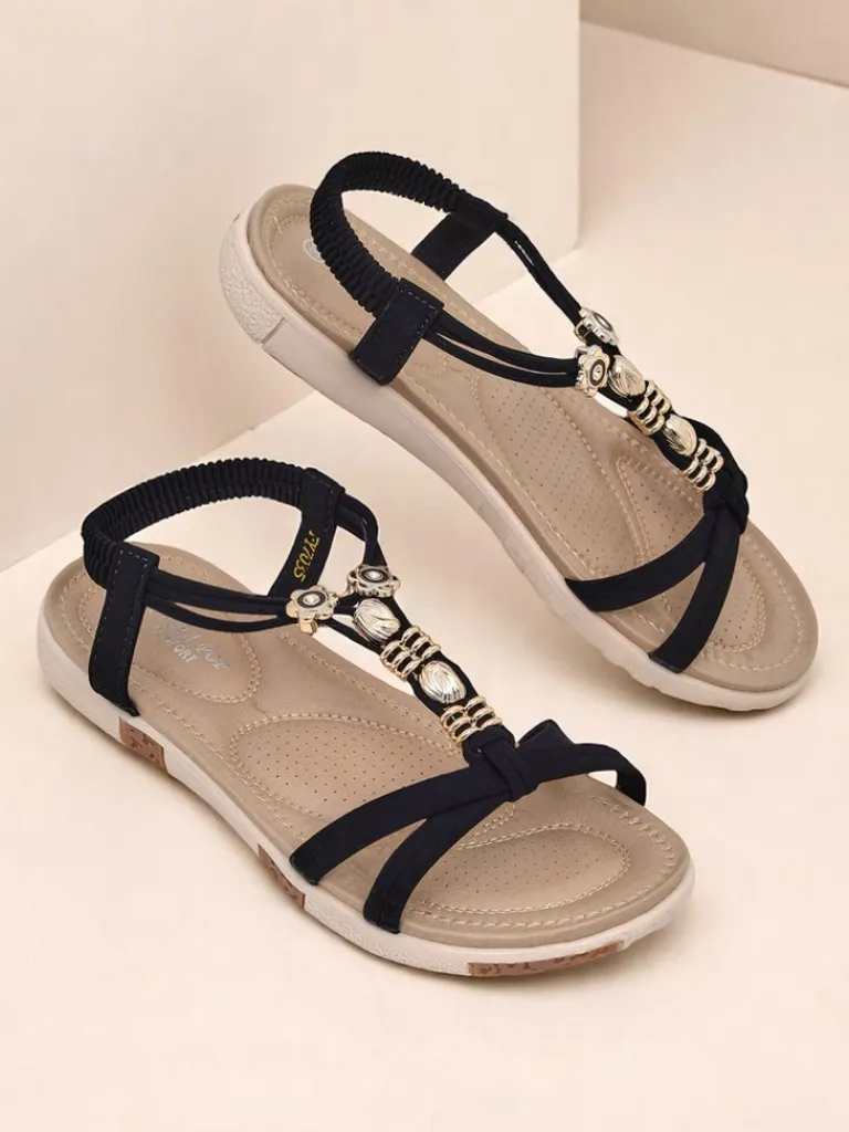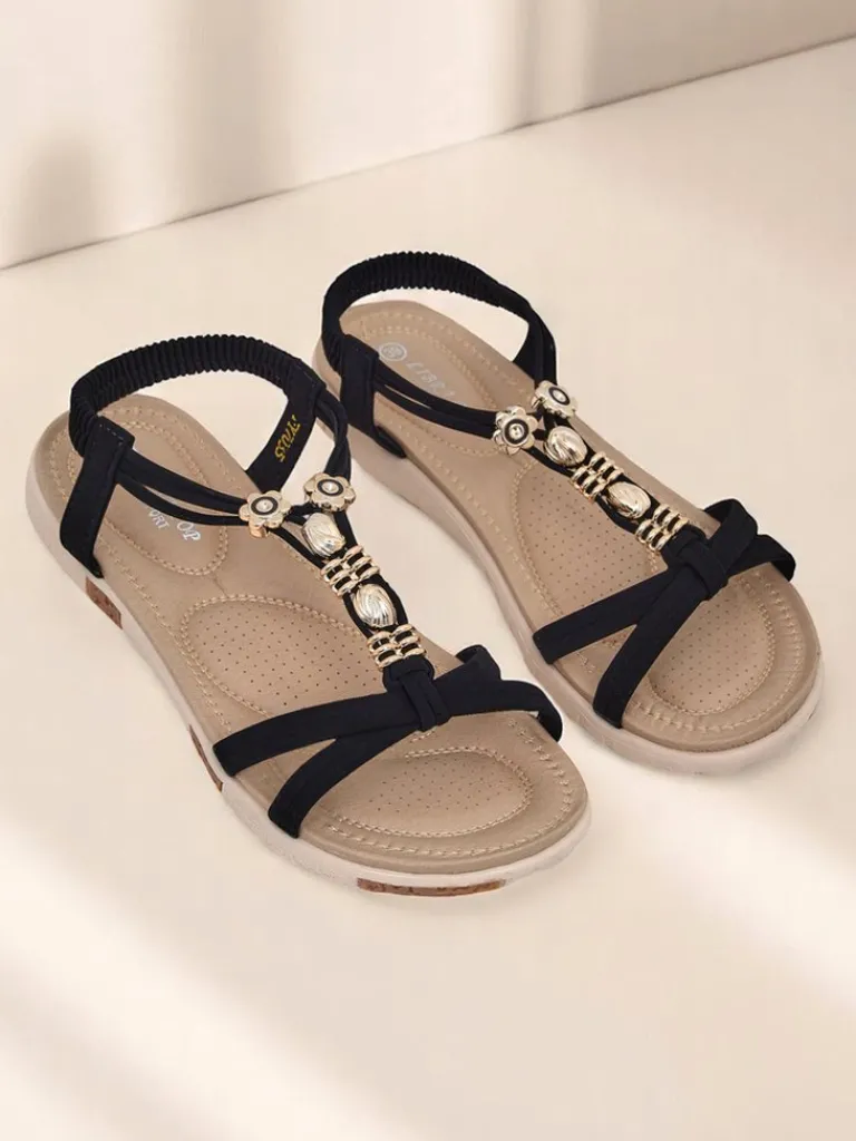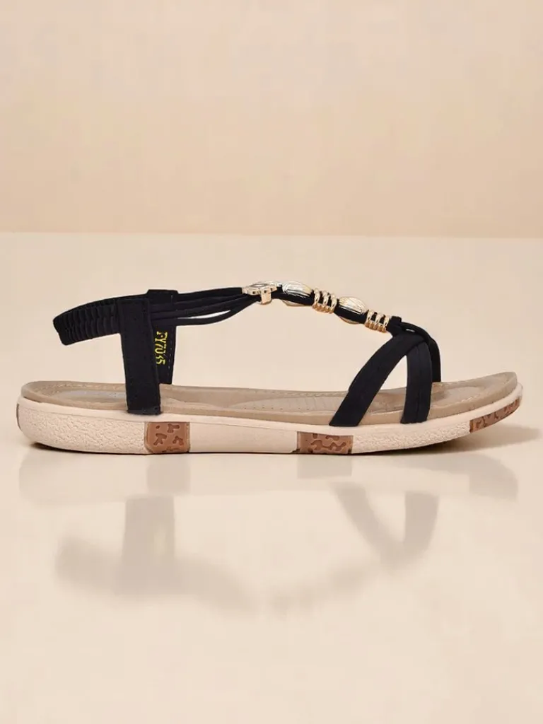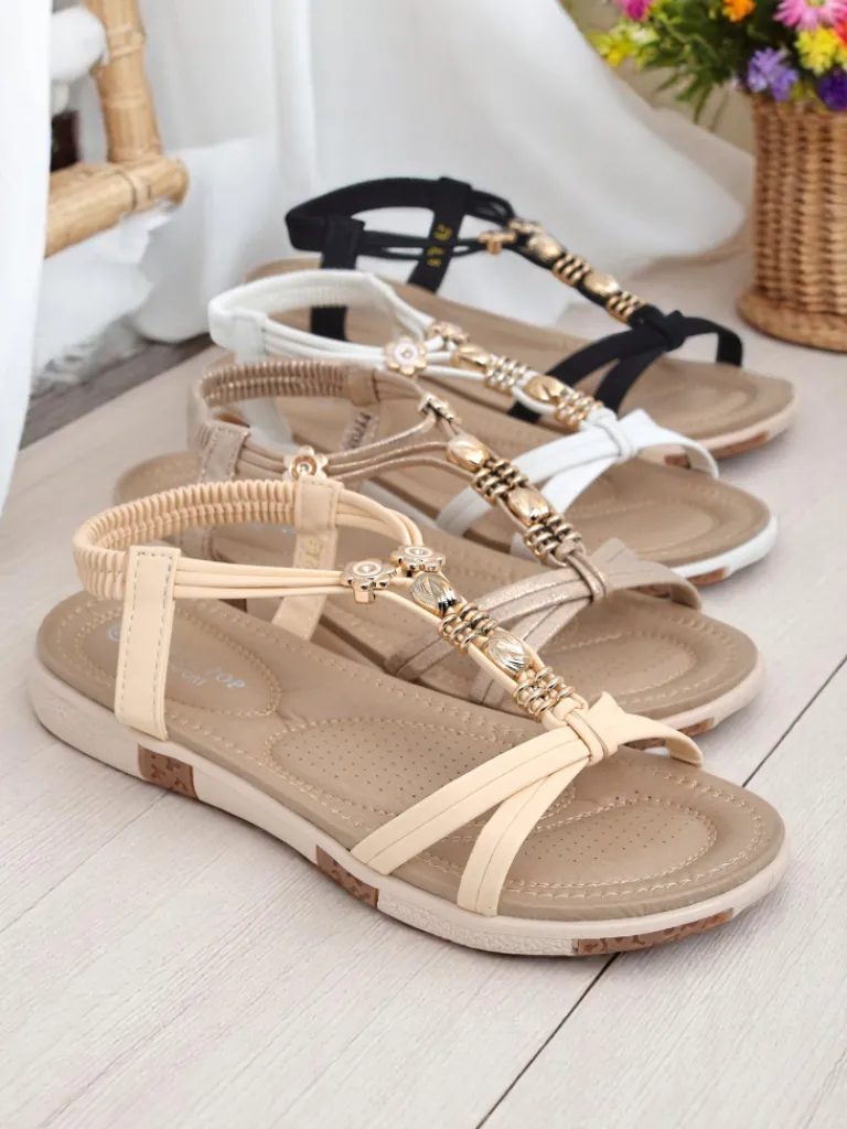 - Damskie sandałki na płaskiej podeszwie – to idealny pomysł na gorące letnie dni. Paseczki wykonane z przyjemnej skóry ekologicznej. Przód udekorowany eleganckimi, plecionymi paseczkami i ozdobami. Obuwie wsuwane.