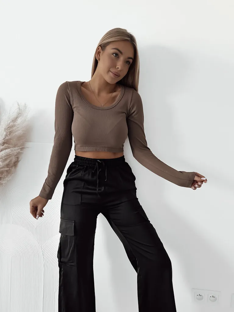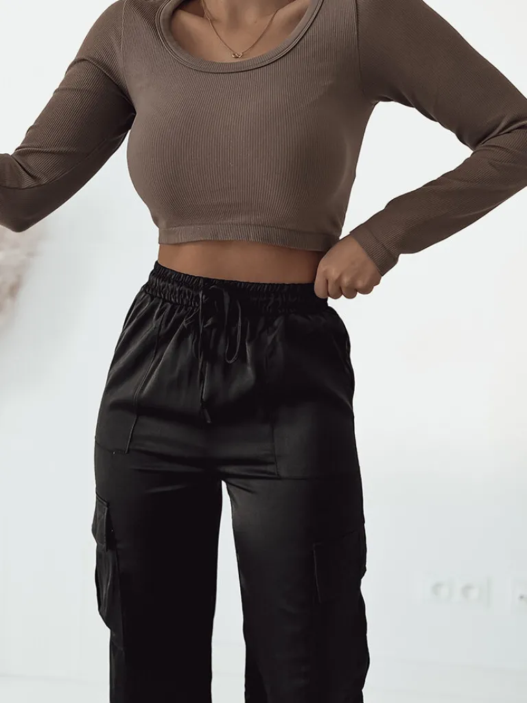 - Wygodne damskie spodnie typu bojówki wykonane z przyjemnej tkaniny. Model posiada 4 kieszenie, w tym też po bokach. Spodnie posiadają gumę i wiązanie w pasie.