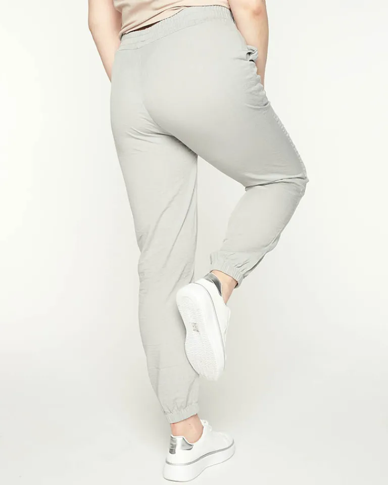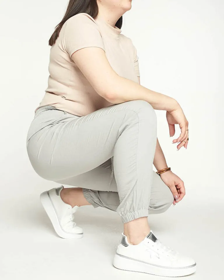 - Klasyczne damskie spodnie z długimi nogawkami o luźnym kroju, zakończone na dole ściągaczami. Model z wysokim stanem, elastyczną gumką w pasie i 2 kieszeniami. UWAGA: Dokładność pomiaru (+/-) 1 cm. Wymiary mierzone na płasko.