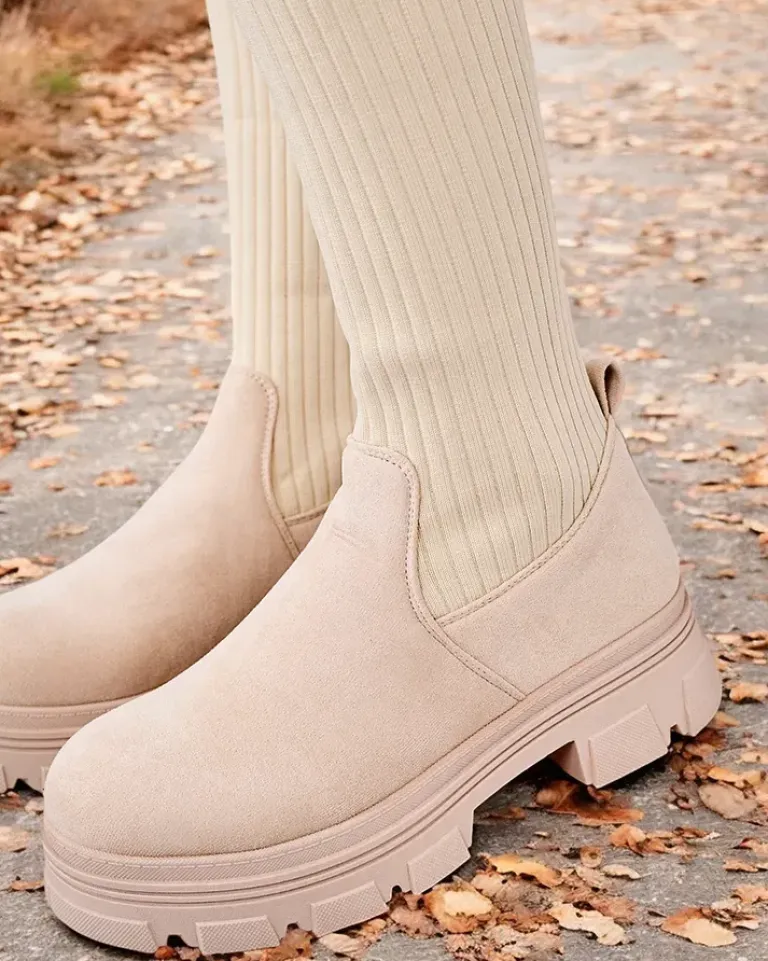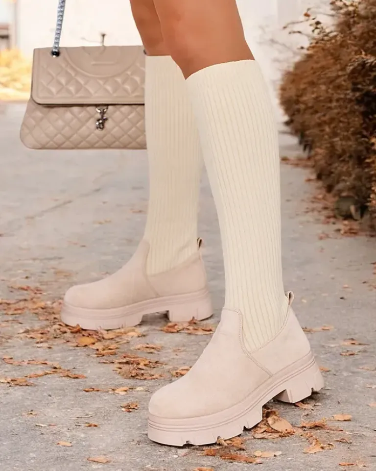 - Stylowe damskie kozaki do kolana na płaskim obcasie. Cholewka wykonana jest z elastycznego materiału tkaninowego w połączeniu z eko zamszem, w środku futerkowa wkładka. Model wsuwany. Idealne do codziennych jesiennych outfitów!