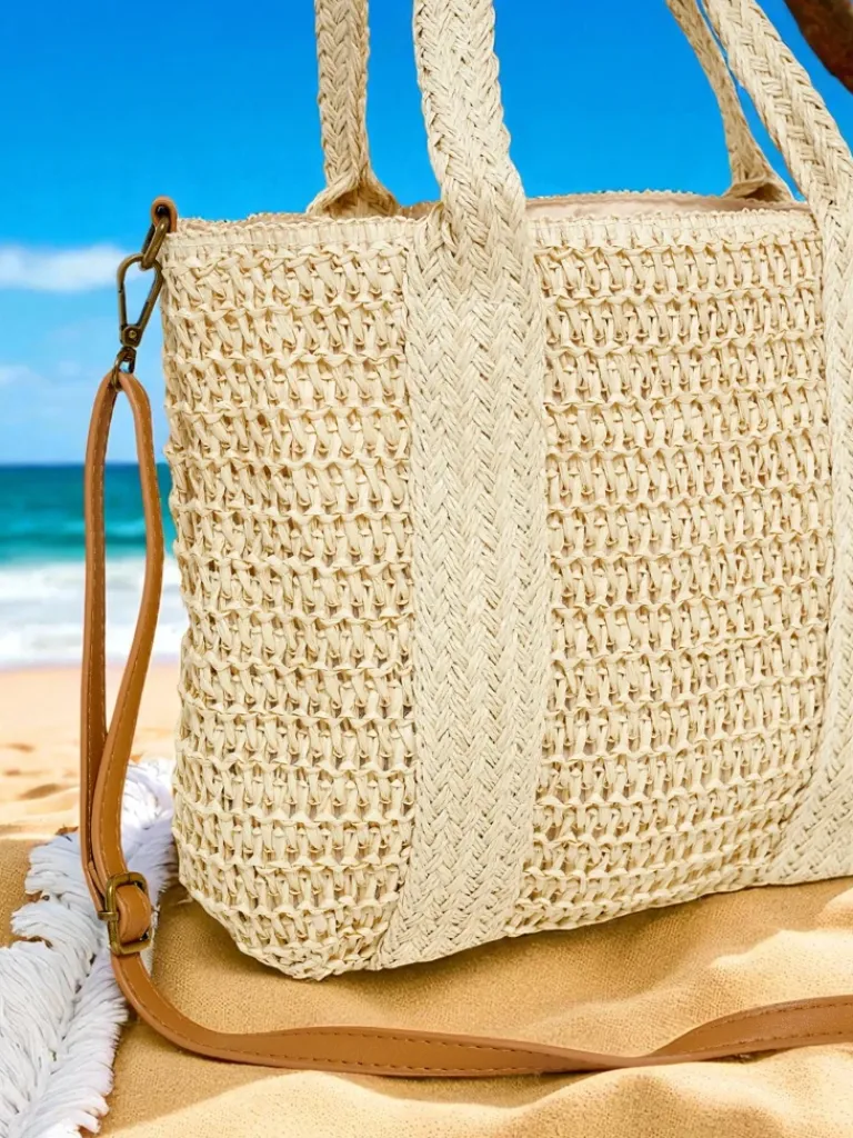 - Stylowa torebka słomiana z jedną komorą i kieszonką, zapinana na suwak. Lekka i przestronna, idealna na letnie dni. Doskonała do casualowych stylizacji, zapewnia wygodę i porządek, zachowując modny, wakacyjny urok. Perfect na plażę i miejskie spacery.