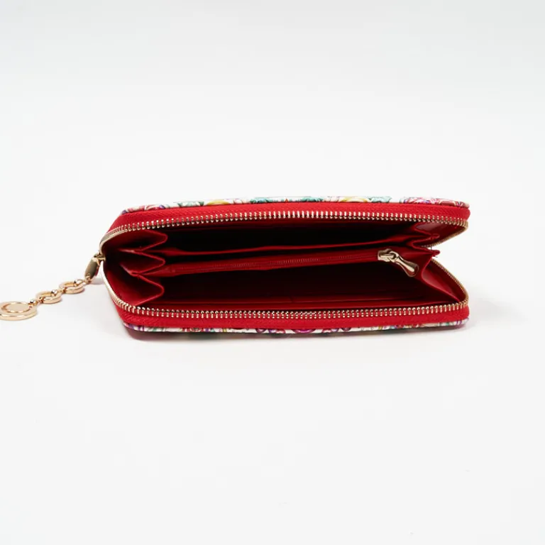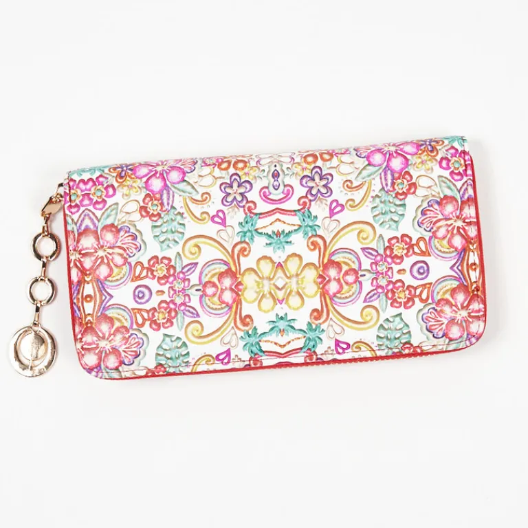- Duży damski portfel wykonany ze skóry ekologicznej wykończonej wzorem w kwiaty. Produkt jest zapinany na zamek błyskawiczny.