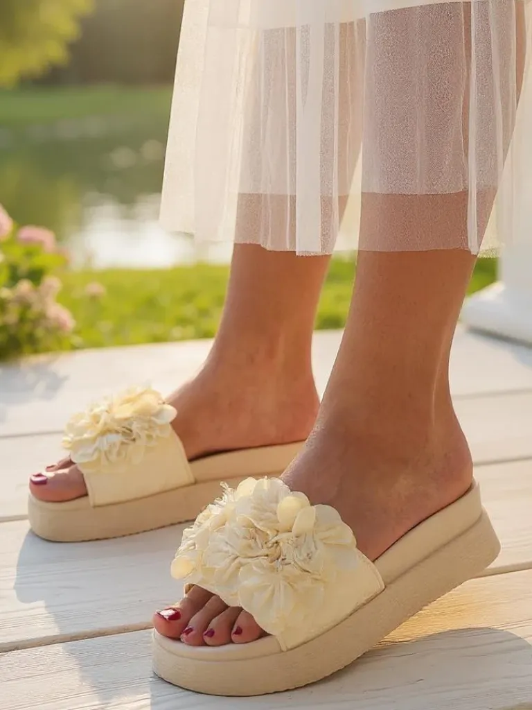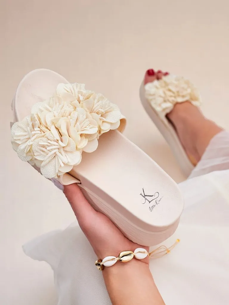 - Przepiękne klapki damskie wykonane ze skóry ekologicznej, zdobione kwiatuszkami. Gumowa, grubsza podeszwa zapewnia komfort na każdym kroku. Idealnie uzupełnią letnie stylizacje!