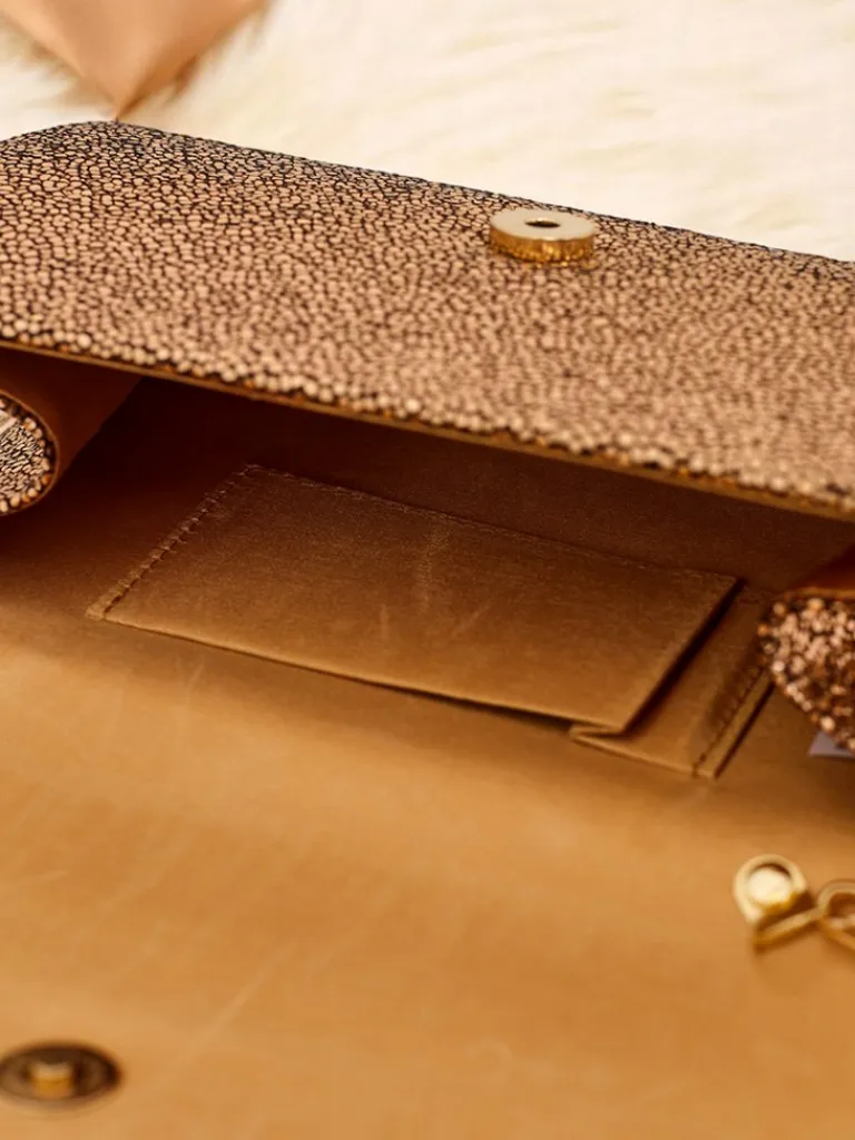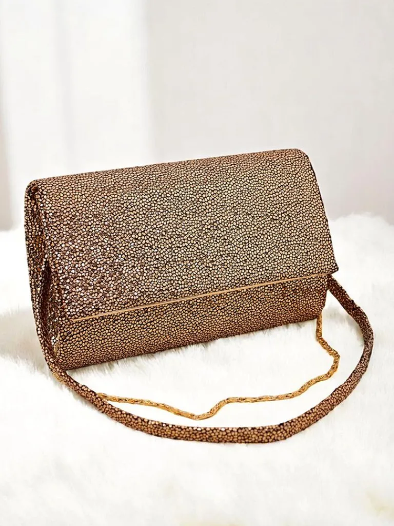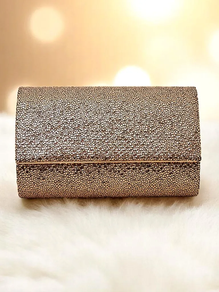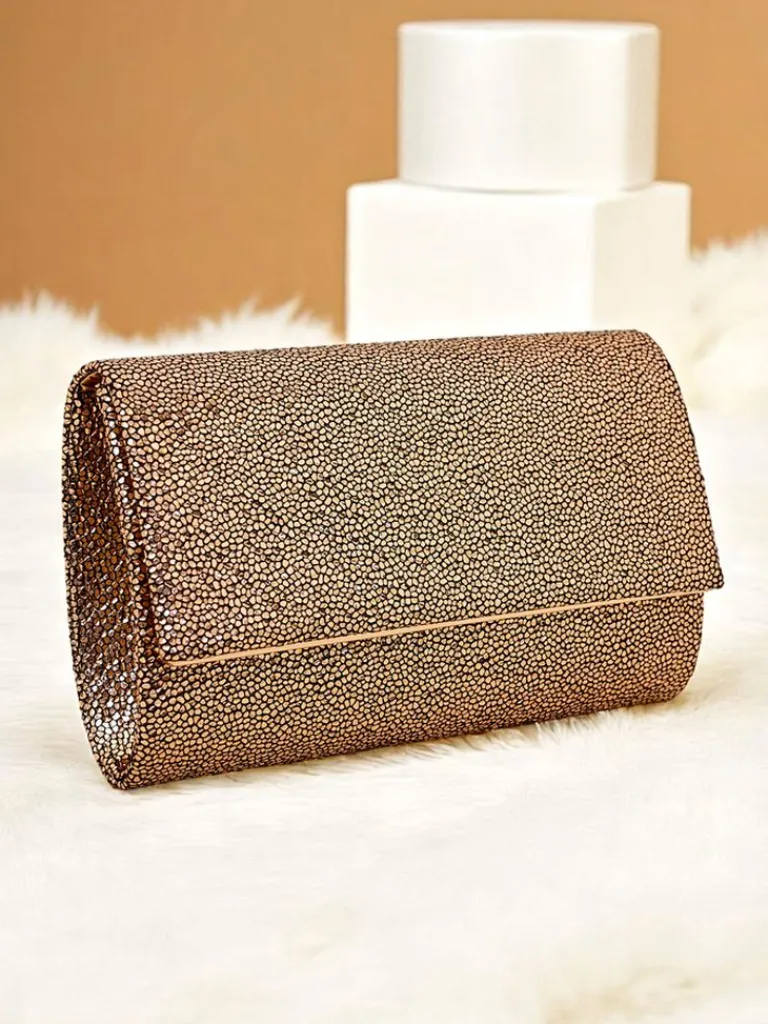 - Stylowa kopertówka z eko skóry, pokryta tkaniną z grubym brokatem. Zapinana na magnes, z odpinanym paskiem – idealna na wieczorne wyjścia i wyjątkowe okazje.