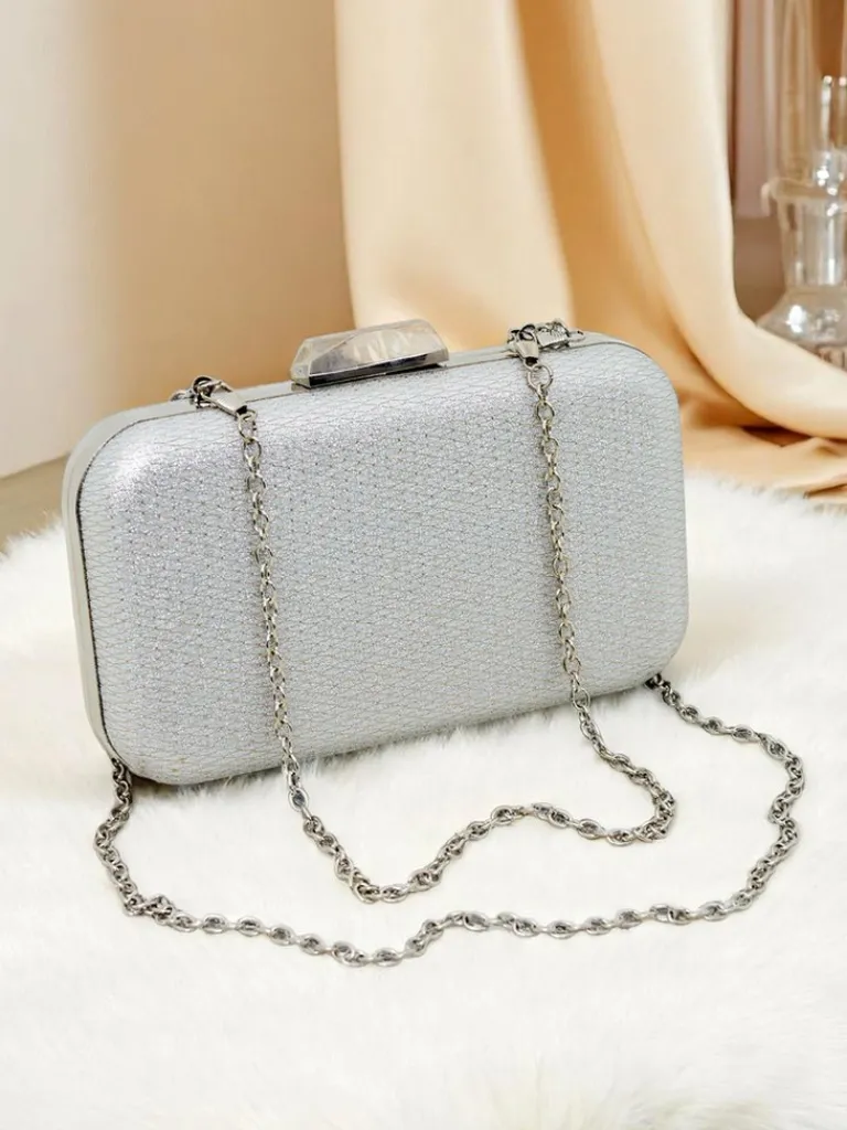 - Kopertowa torebka z eko skóry, pokryta tkaniną z połyskującą nicią i subtelnym tłoczeniem. Zapinana na zatrzask, z odpinanym łańcuszkiem — szyk i blask w jednym.