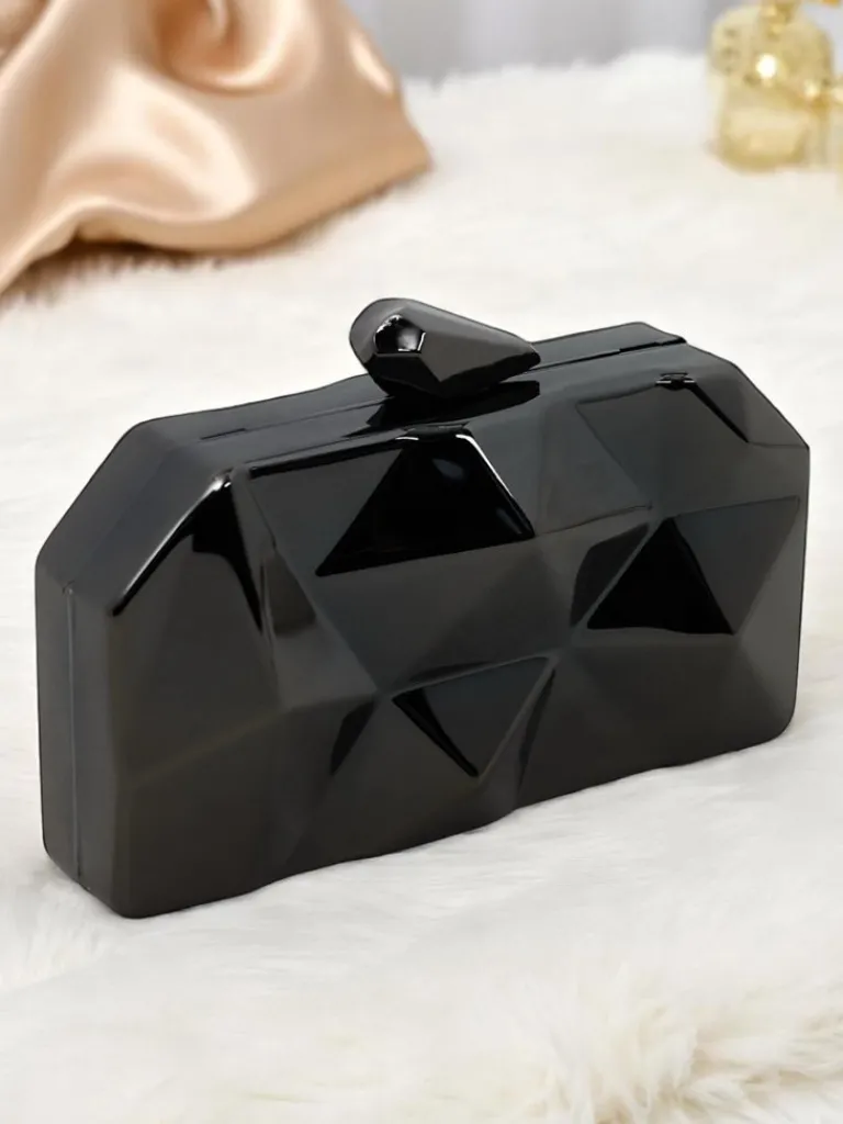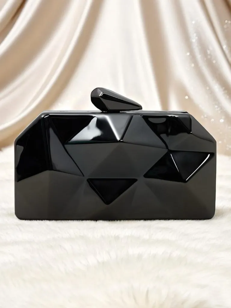 - Awangardowa kopertówka o nieregularnym kształcie, wykonana z metalu. Zapinana na zatrzask, z odpinanym łańcuszkiem — futurystyczny blask dla odważnych stylizacji.