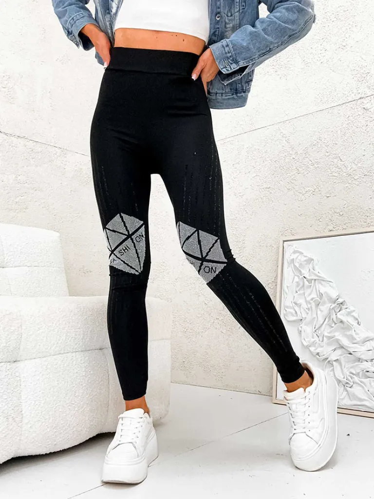 - Stylowe legginsy wykonane z elastycznej tkaniny. Szeroka guma w pasie zapewnia komfort noszenia. Całość zdobiona cyrkoniami. Idealne na aktywny dzień!