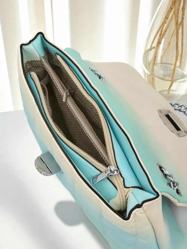 - Elegancka kopertowa torebka z eko skóry z efektem ombre. Zamykana na zamek i zatrzask. Metalowy łańcuszek zamiast paska dodaje szyku. 1 komora idealna na najważniejsze rzeczy na wieczór i specjalne okazje.