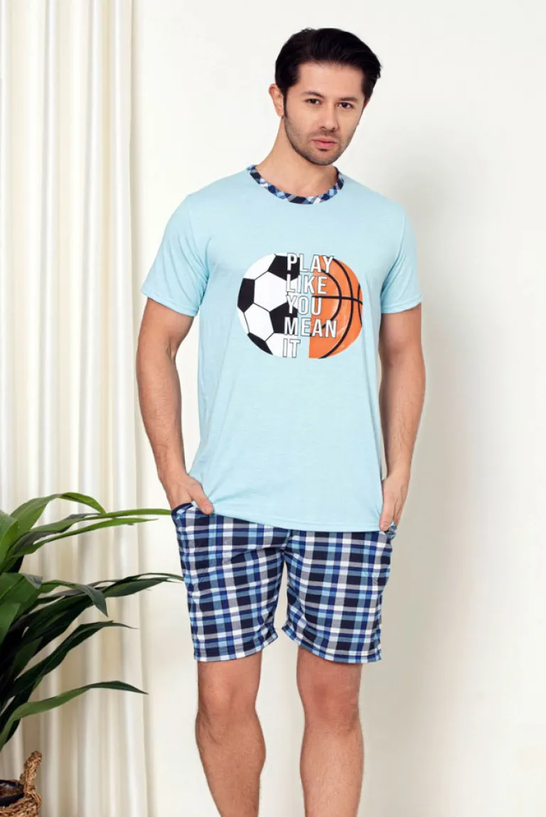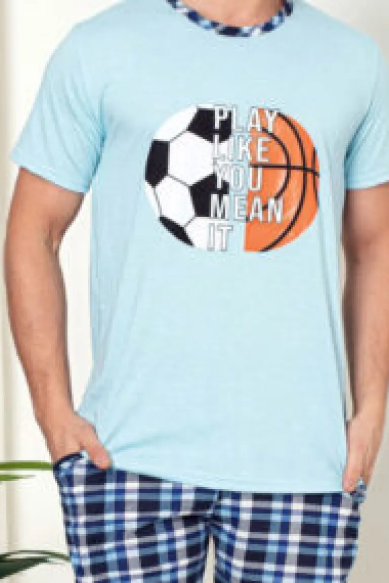 - Wygodna męska piżama 2- częściowa z krótkim rękawem i krótkimi nogawkami wykonana z materiału bawełnianego. Model zdobiony printem. Idealna na domowe wieczory! UWAGA: Dokładność pomiaru (+/-) 1 cm.