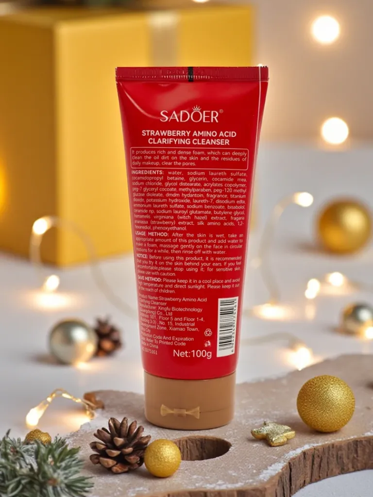 - Oczyszczający żel do twarzy z truskawką i aminokwasami skutecznie usuwa zanieczyszczenia, odświeża i rozjaśnia cerę. Nawilża i wygładza skórę, pozostawiając ją miękką, promienną i pełną naturalnego blasku.