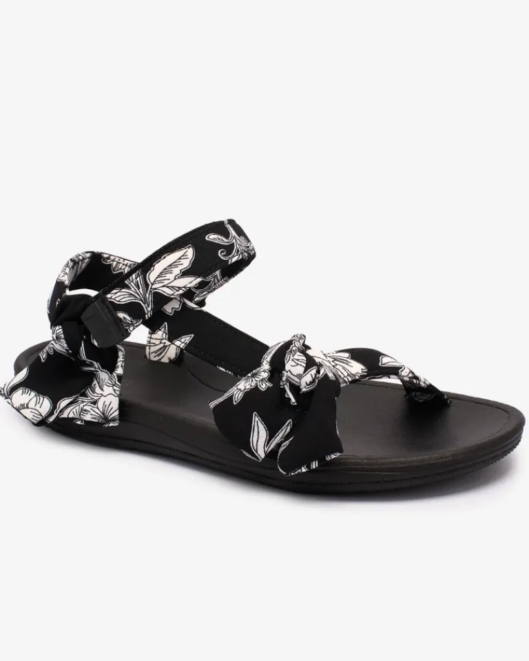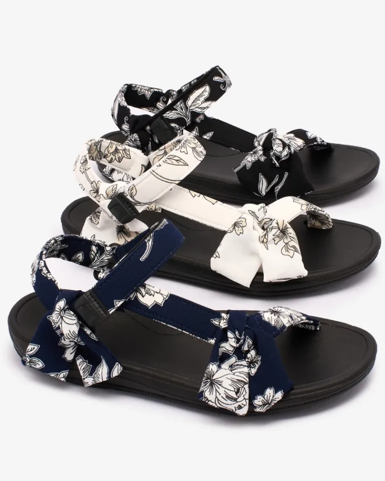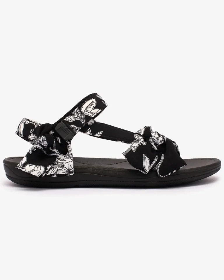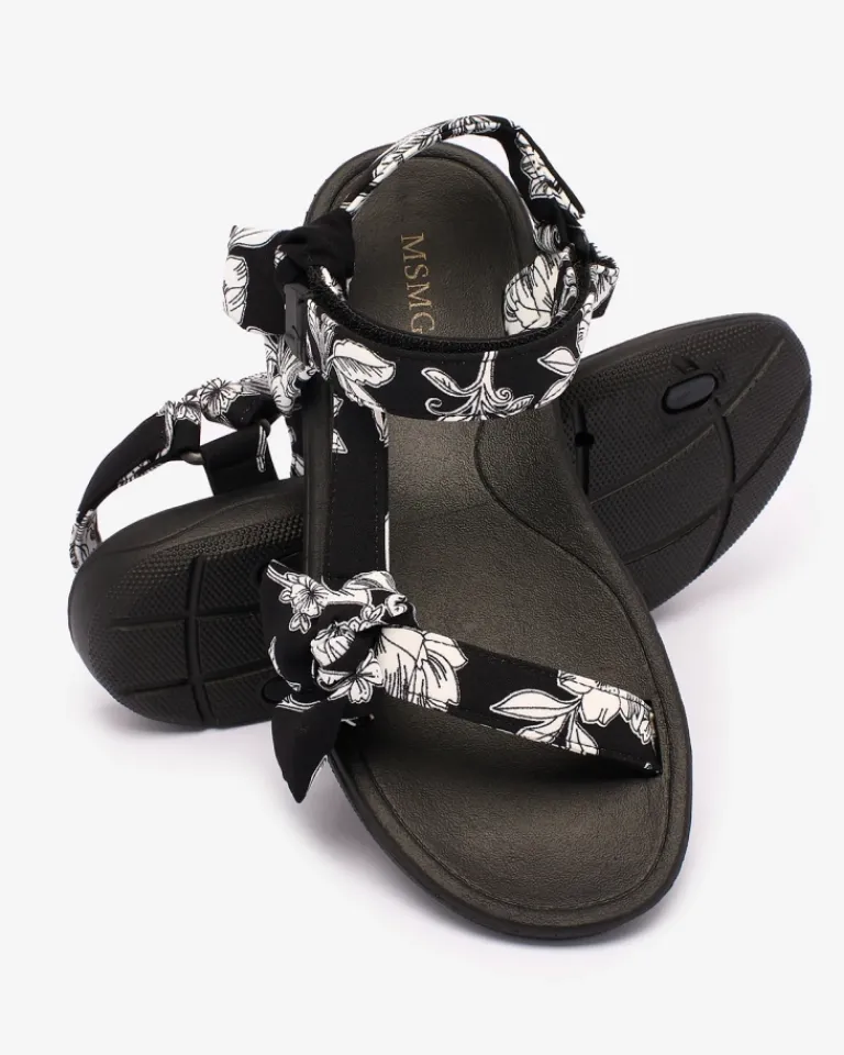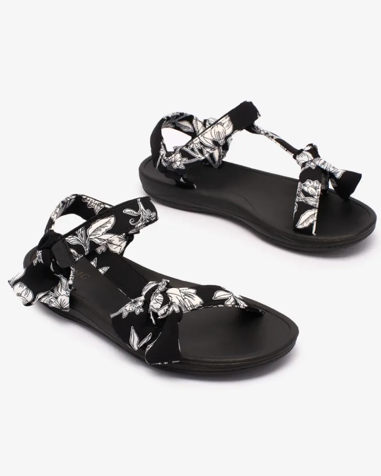 - Sportowe damskie sandały na płaskiej, gumowej podeszwie. Paseczki są wykonane z materiału tkaninowego zdobionego printem i kokardkami. Prezentowane obuwie damskie jest zapinane na rzepy. Stylowe i komfortowe!