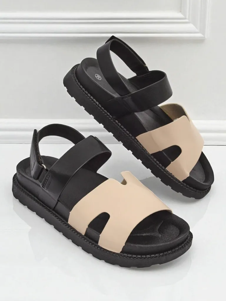 - Damskie sandały z ekologicznej skóry, na płaskiej podeszwie, zapinane na wygodne rzepy. Ozdobne paseczki dodają stylu – idealne na co dzień, łączą komfort i modny wygląd.