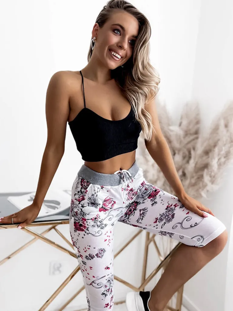 - Wygodne damskie spodenki 3/4 z kieszeniami, wykonane z tkaniny bawełnianej w kwiaty. Model posiada gumę oraz wiązane toczki w pasie. UWAGA: Dokładność pomiaru (+/-) 1 cm.