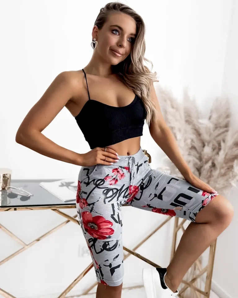 - Komfortowe damskie materiałowe spodenki w kwiaty o długości 3/4, wykonane z tkaniny bawełnianej. Model posiada średni stan, gumkę w pasie oraz 2 wsuwane kieszenie. UWAGA: Dokładność pomiaru (+/-) 1 cm.