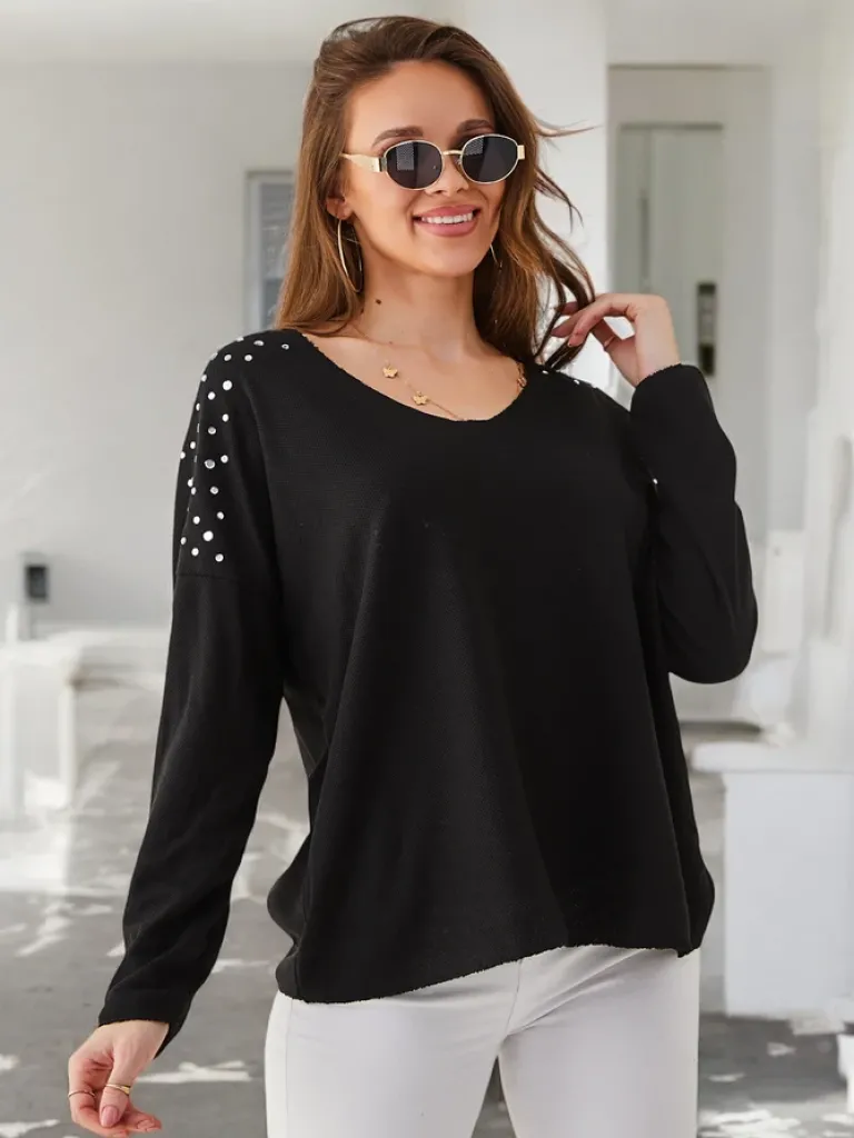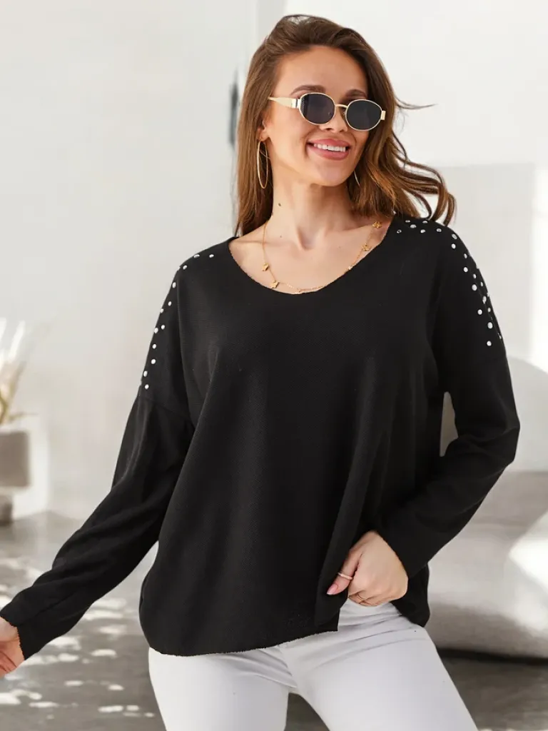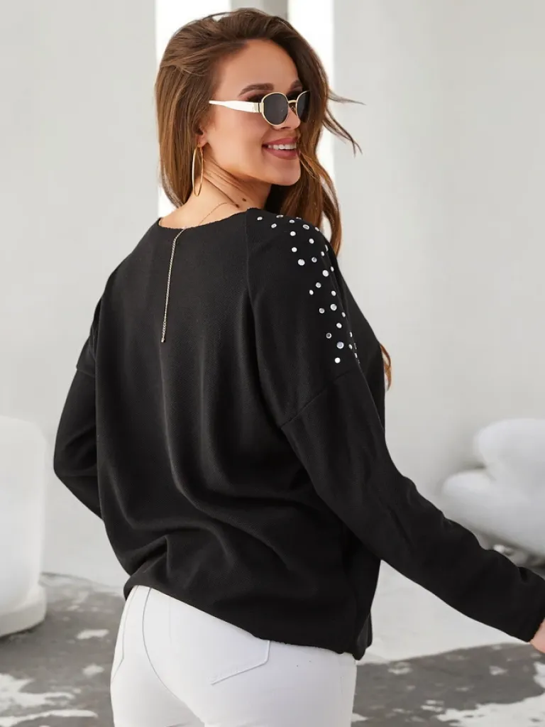 - Sweter damski z dekoltem w serek wykonany z przyjemnej tkaniny. Model posiada długie rękawy. Jest zdobiony cyrkoniami na ramionach. Idealna baza do zimowych outfitów!