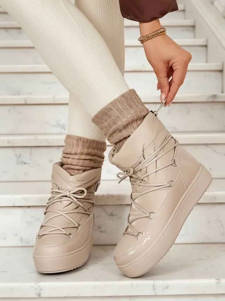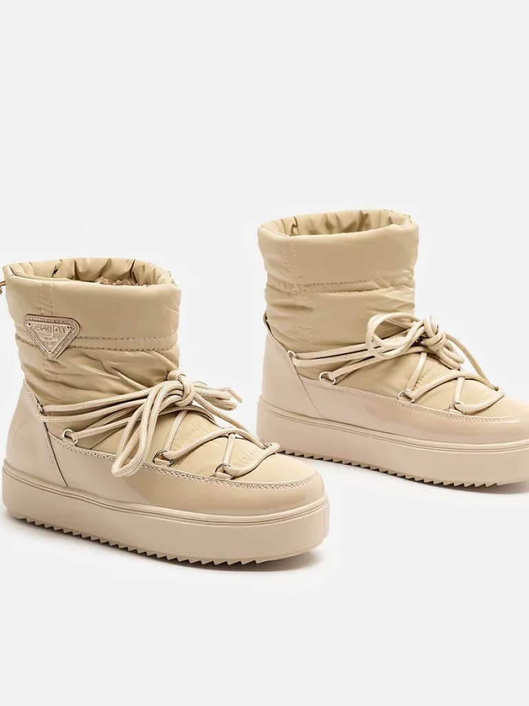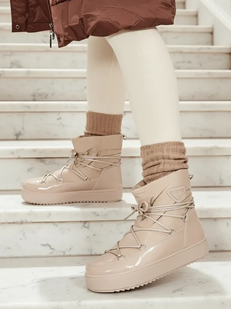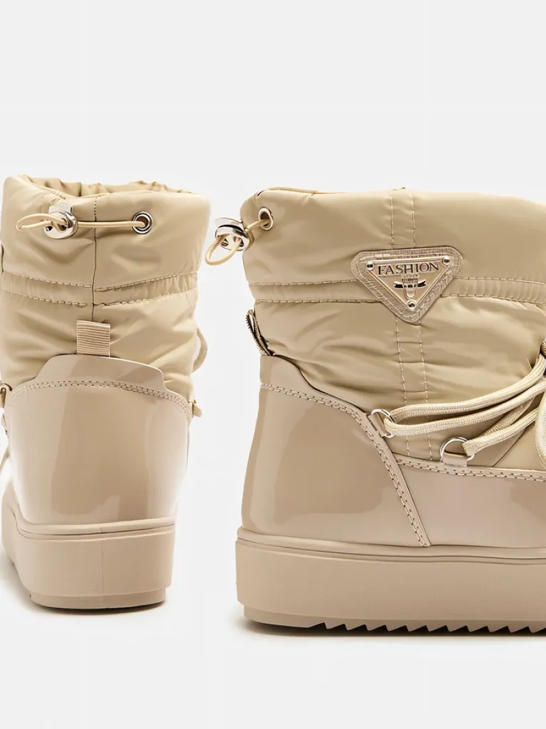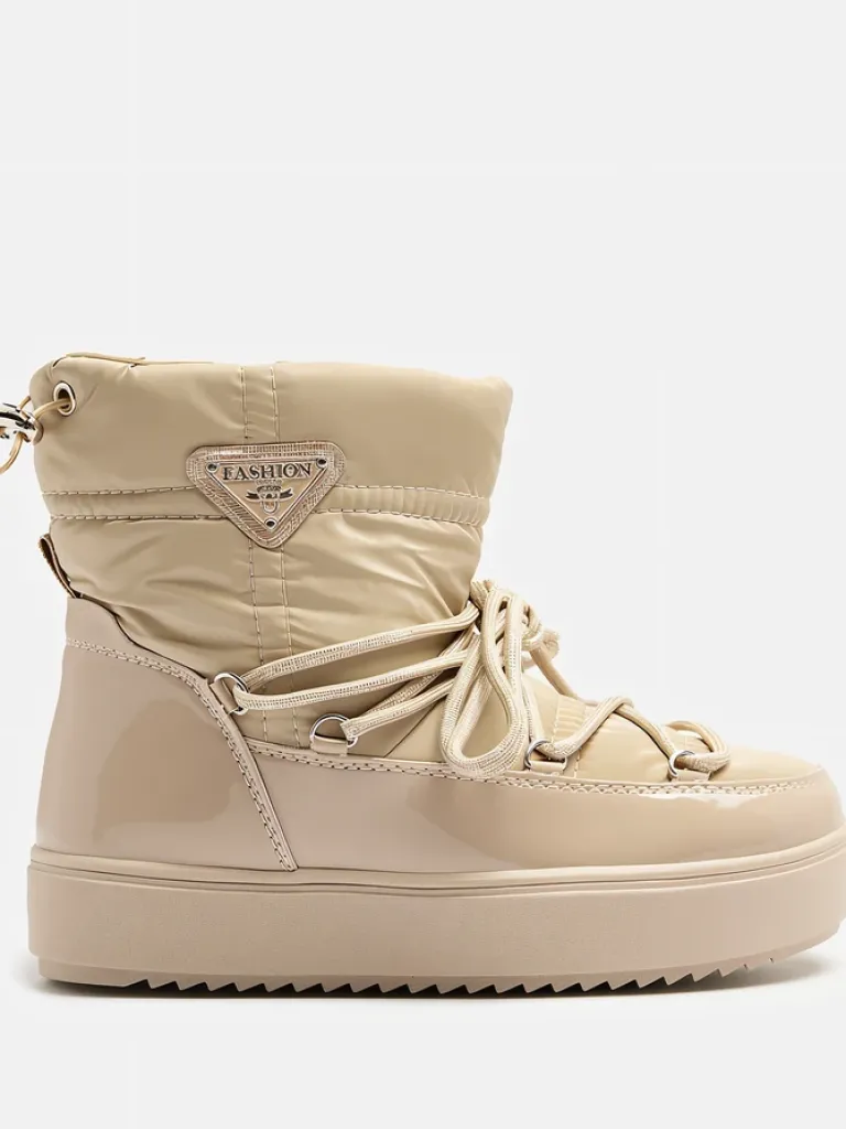 - Damskie obuwie typu śniegowce z cholewką wykonaną z połączenia eko skóry lakierowanej oraz materiału a’la cerata. W środku ocieplenie w formie futerka, obuwie wsuwane. Model posiada ściągacz na końcu cholewki. Idealne na zimę!