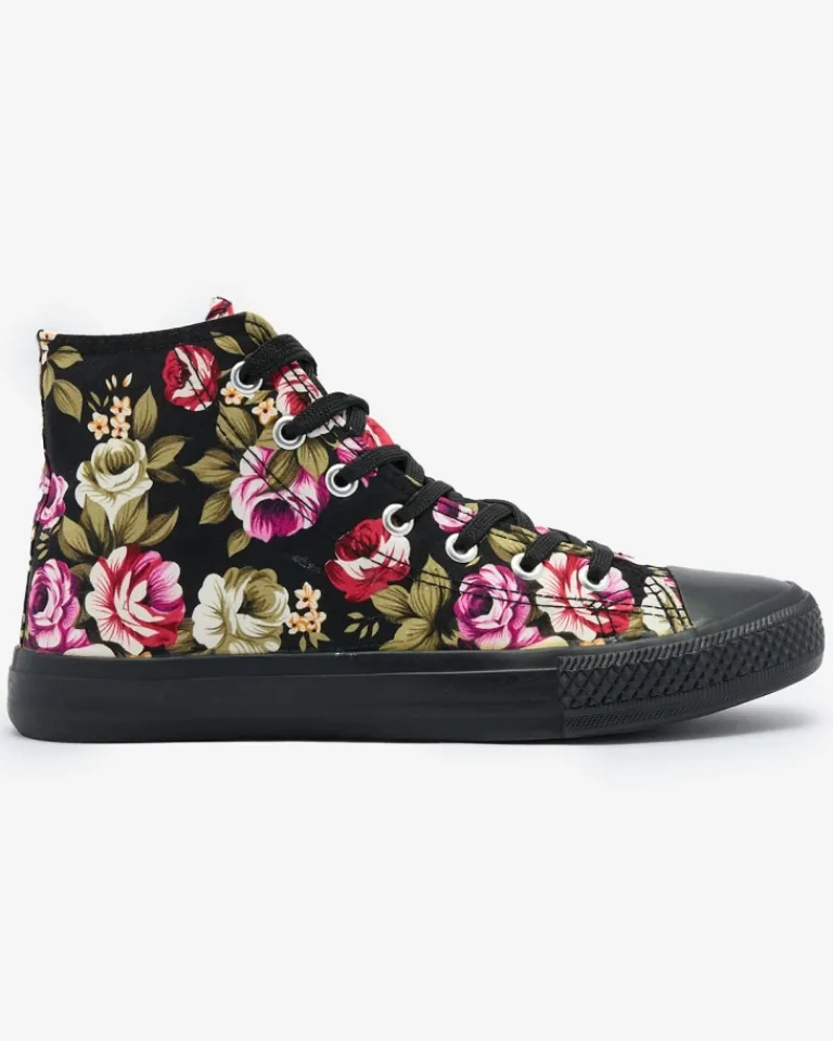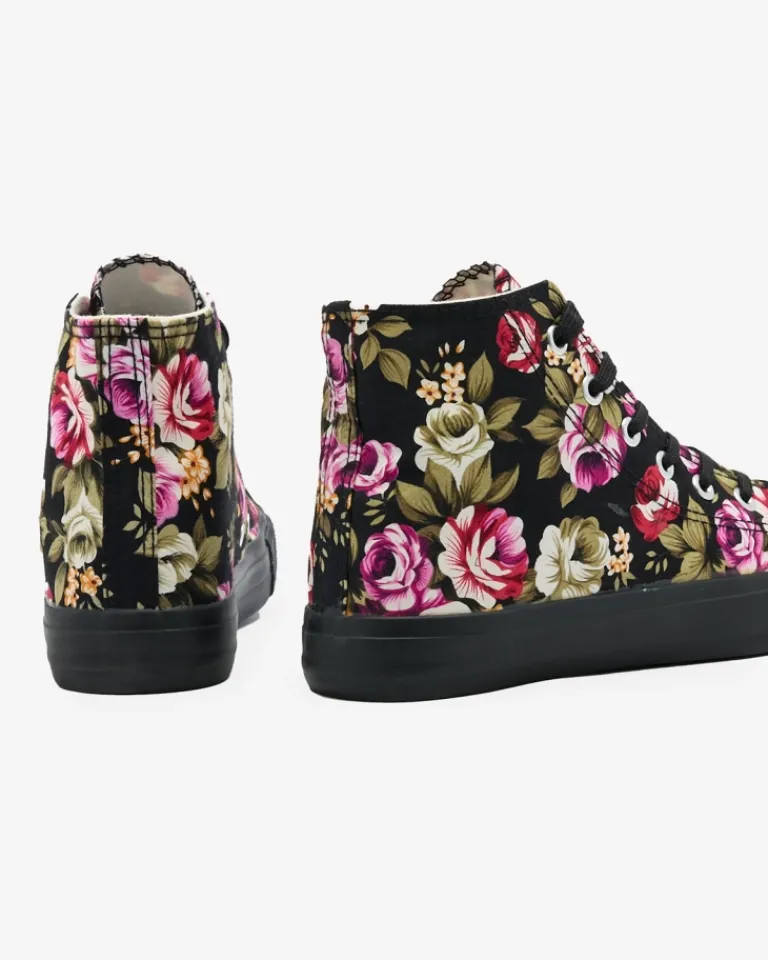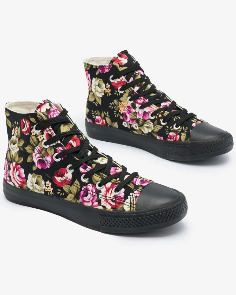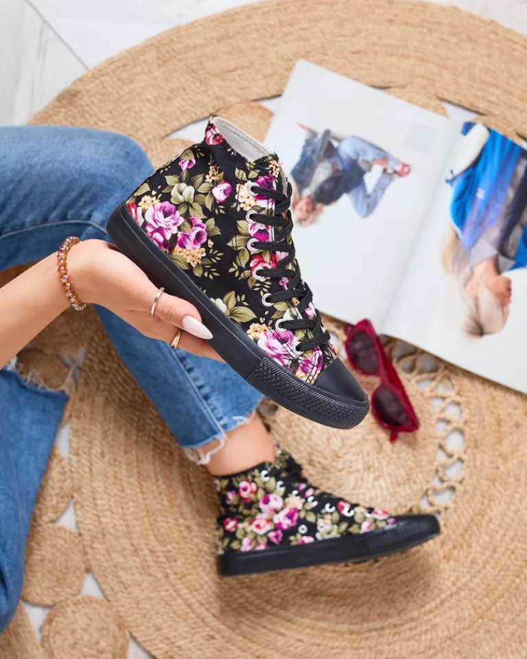 - Modne damskie wysokie trampki wykonane z tkaniny na gumowej podeszwie. Sznurowane i zdobione printem w kwiaty, dodające uroku. Wygodne i stylowe, idealne na casualowe stylizacje.