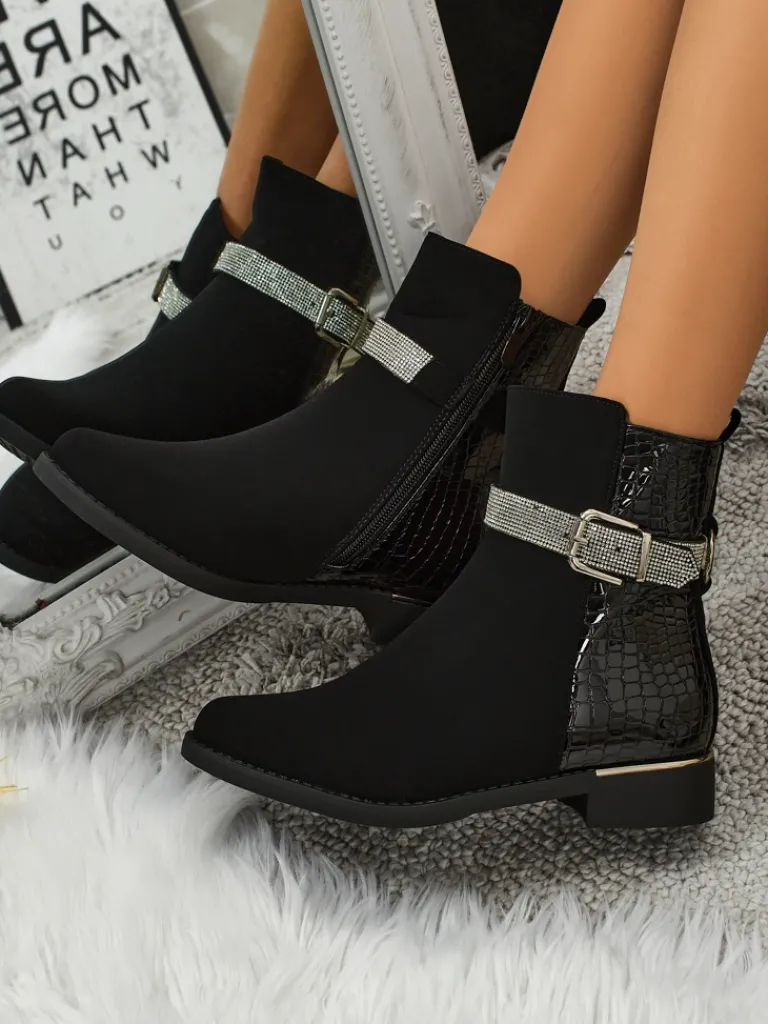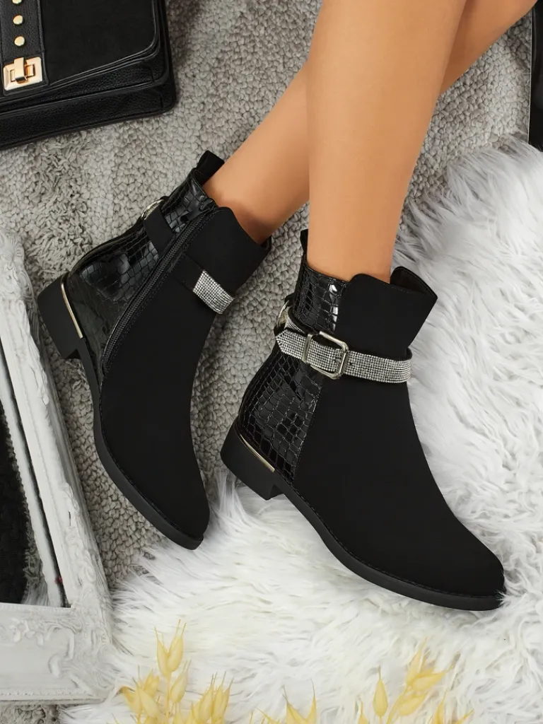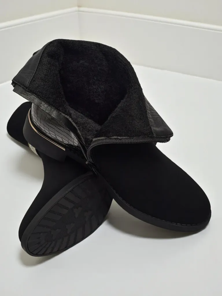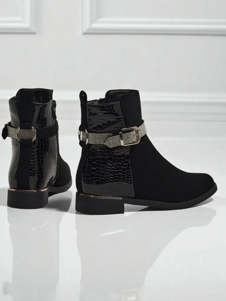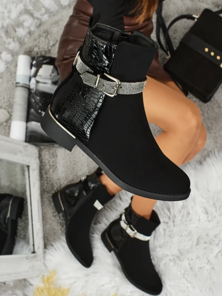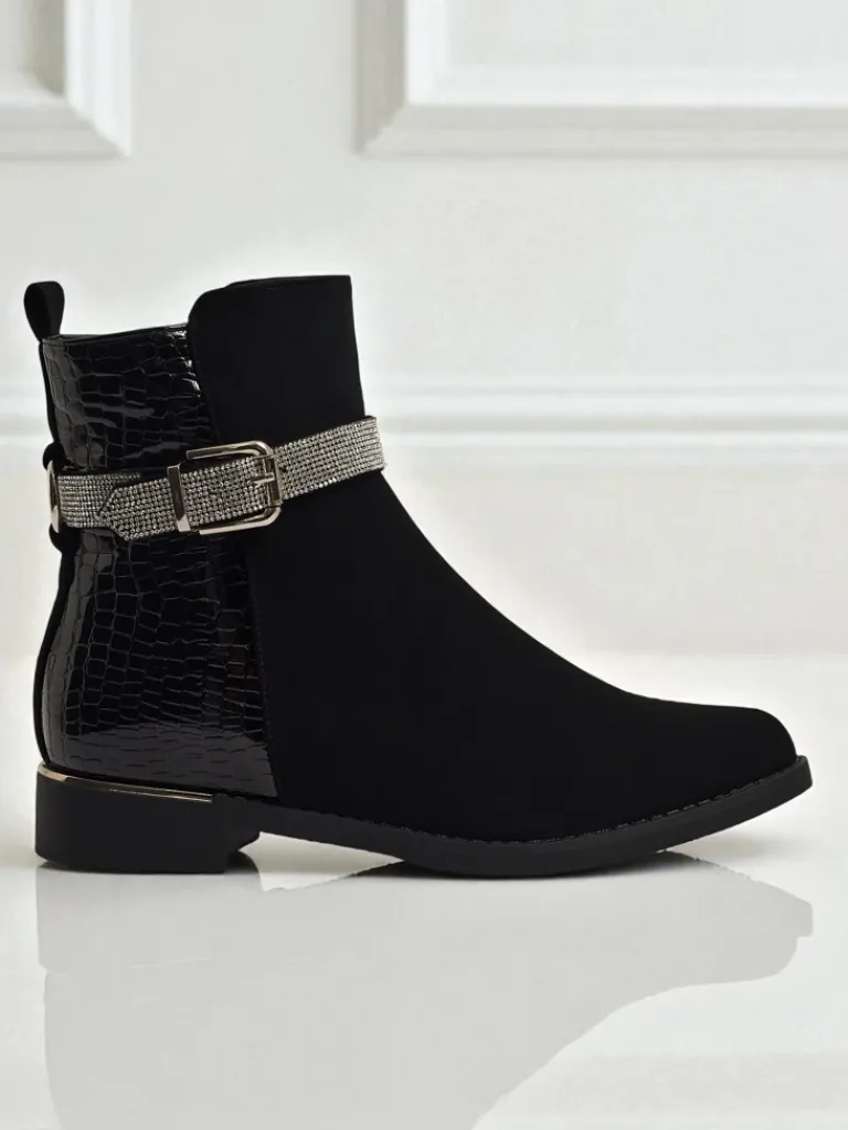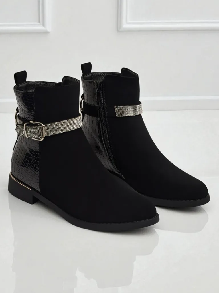 - Damskie botki zapinane na zamek. Model wykonany z połączenie skóry ekologicznej matowej i lakierowanej, na płaskiej podeszwie. Posiada ocieplenie a’la futerko. Zdobione cyrkoniami. Wygodny i stylowy, idealny na jesień!