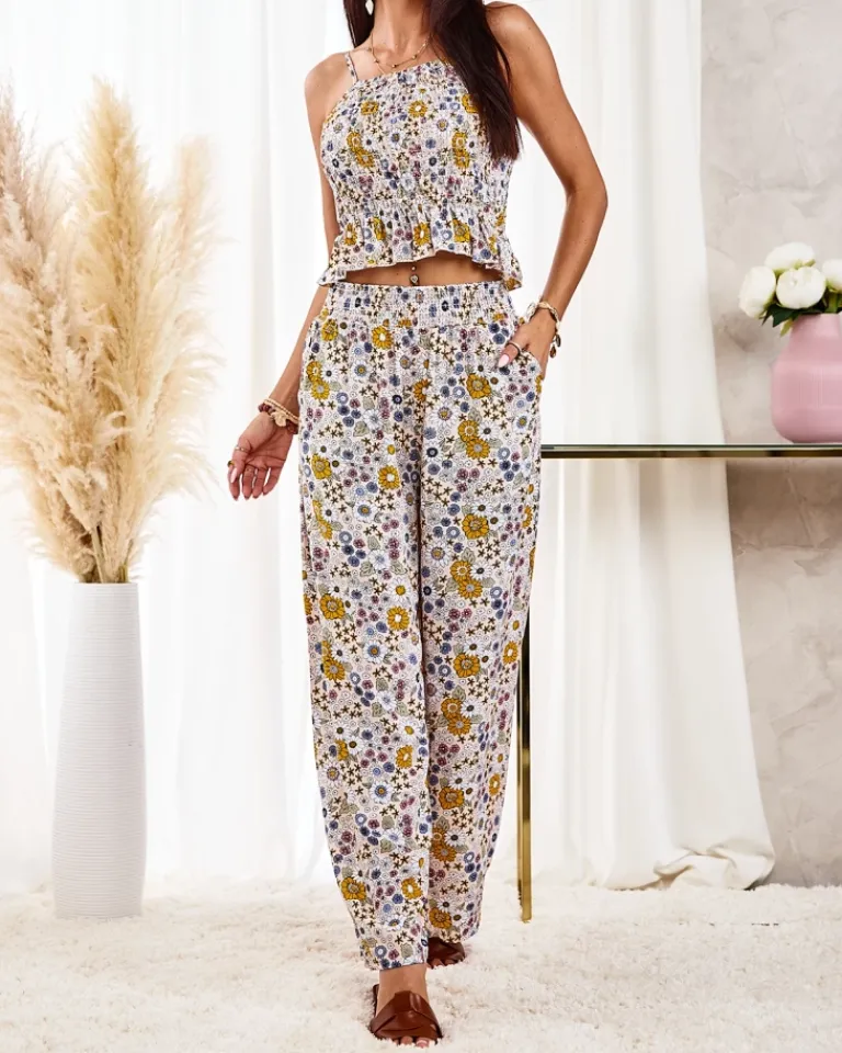 - Wzorzysty letni damski komplet wykonany z przyjemnej i lekkiej tkaniny. Krótki top posiada regulowane ramiączka, prostokątny dekolt oraz gumkę w pasie. Materiałowe szerokie spodnie są wyposażone w gumę w talii. UWAGA: Dokładność pomiaru (+/-) 1 cm.