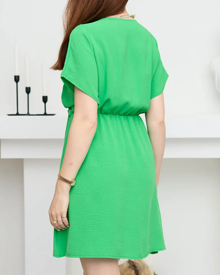 - Unikalna damska krótka sukienka z ozdobnym łańcuszkiem w pasie, wykonana z lekkiej tkaniny. Produkt z elastycznym i kopertowym dekoltem, posiada krótkie rękawy oraz gumkę w talii. Fantastyczna, elegancka sukienka! UWAGA: Dokładność pomiaru (+/-) 1 cm.