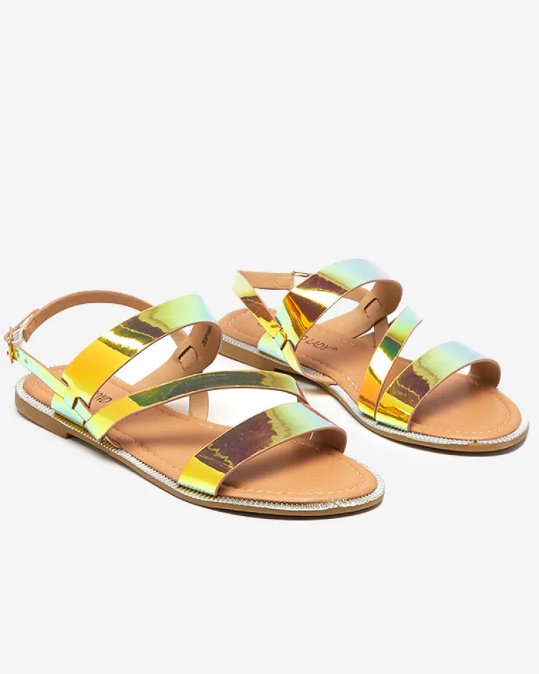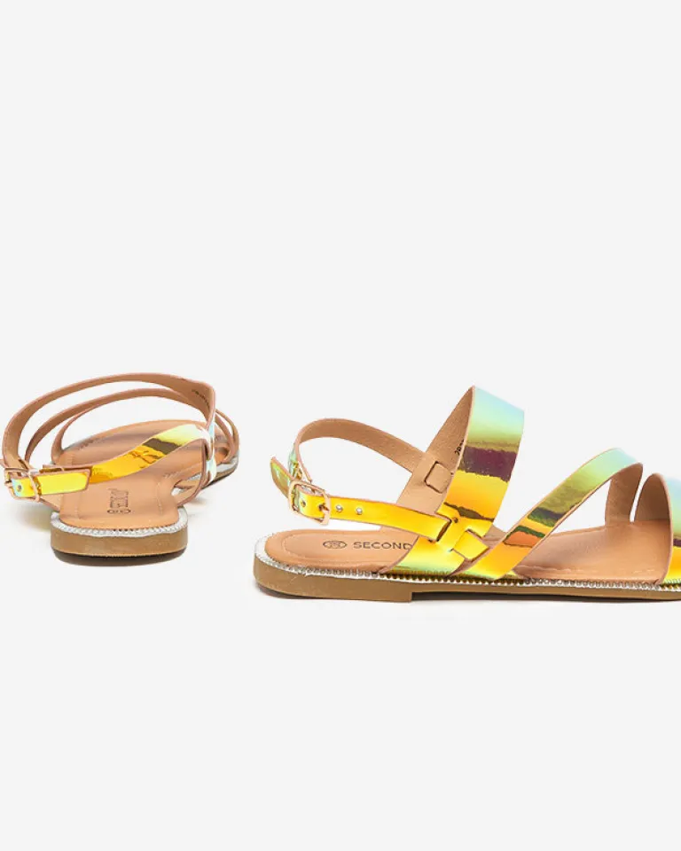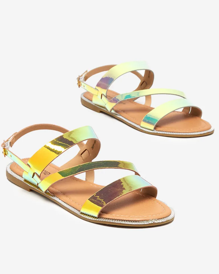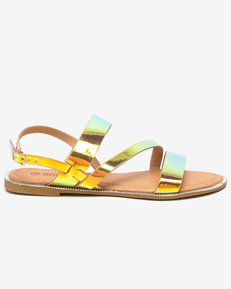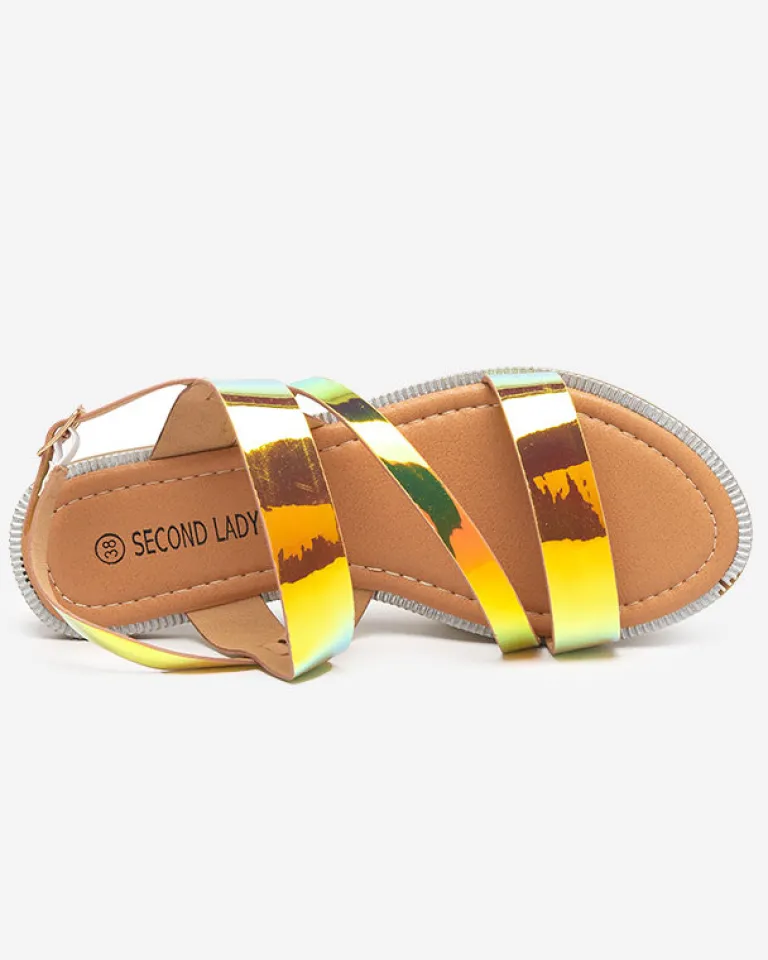 - Oryginalne damskie sandały na płaskim obcasie, wykonane z lakierowanej holograficznej eko skóry. Produkt zapinany sprzączką na wysokości kostki, posiada wkładkę ze skóry ekologicznej. Idealne na wakacje!