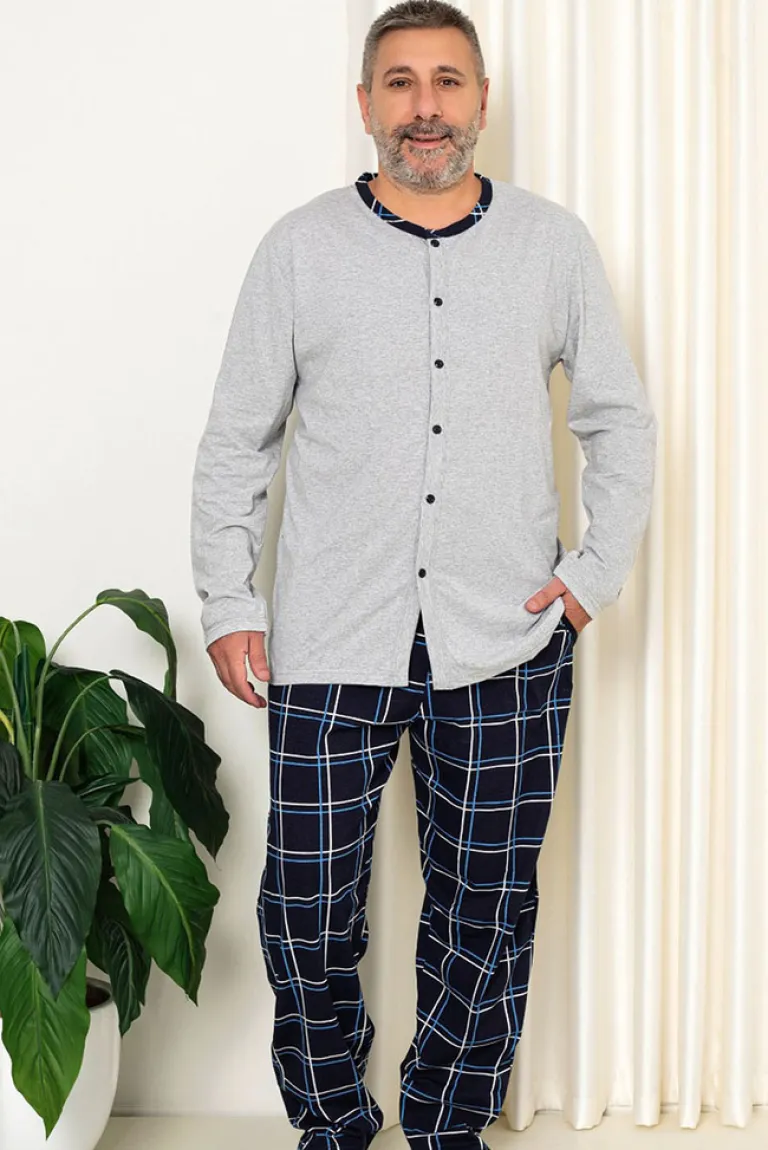 - Wygodna męska piżama 2- częściowa z długim rękawem i długimi nogawkami wykonana z materiału bawełnianego. Model zapinany na guziki i zdobiony printem w kratkę. Idealna na domowe wieczory!
