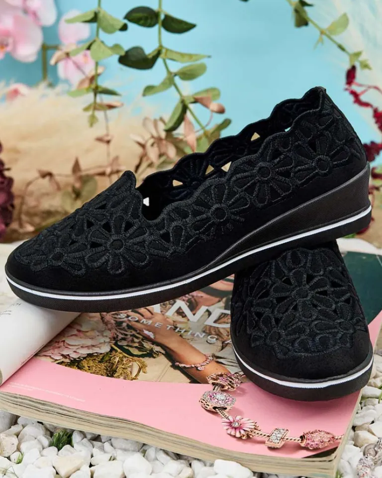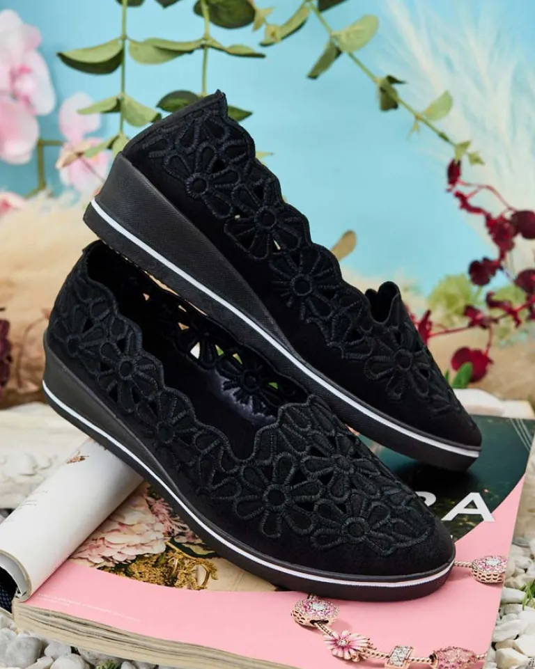 - Przepiękne damskie półbuty typu mokasyny na niskim koturnie. Model w stylu casual, jest wykonany w całości ze skóry ekologicznej zamszowej. Model posiada elegancki haft. Idealna baza dla wielu codziennych looków!