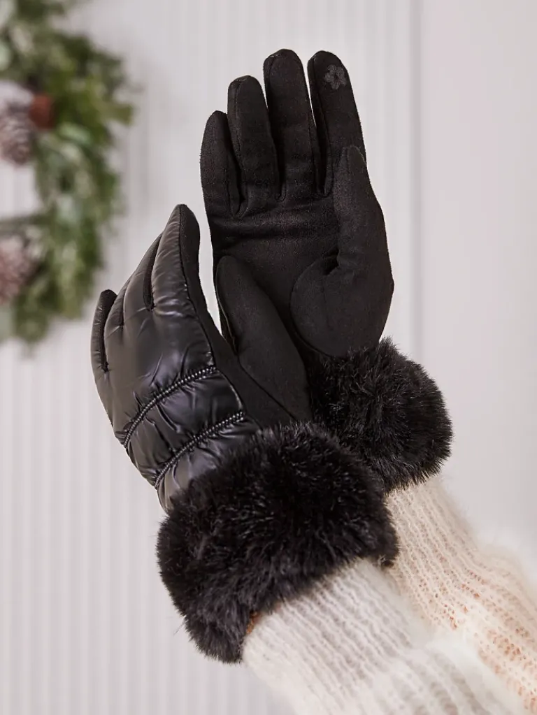 - Cieplutkie rękawiczki wykonane z materiału a’la cerata, po wewnętrznej stronie pokryte tkaniną. Wewnątrz miękka, futrzana podszewka, w dolnej części również futerko. Idealne na mroźne dni!
