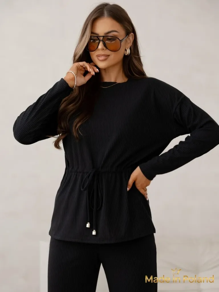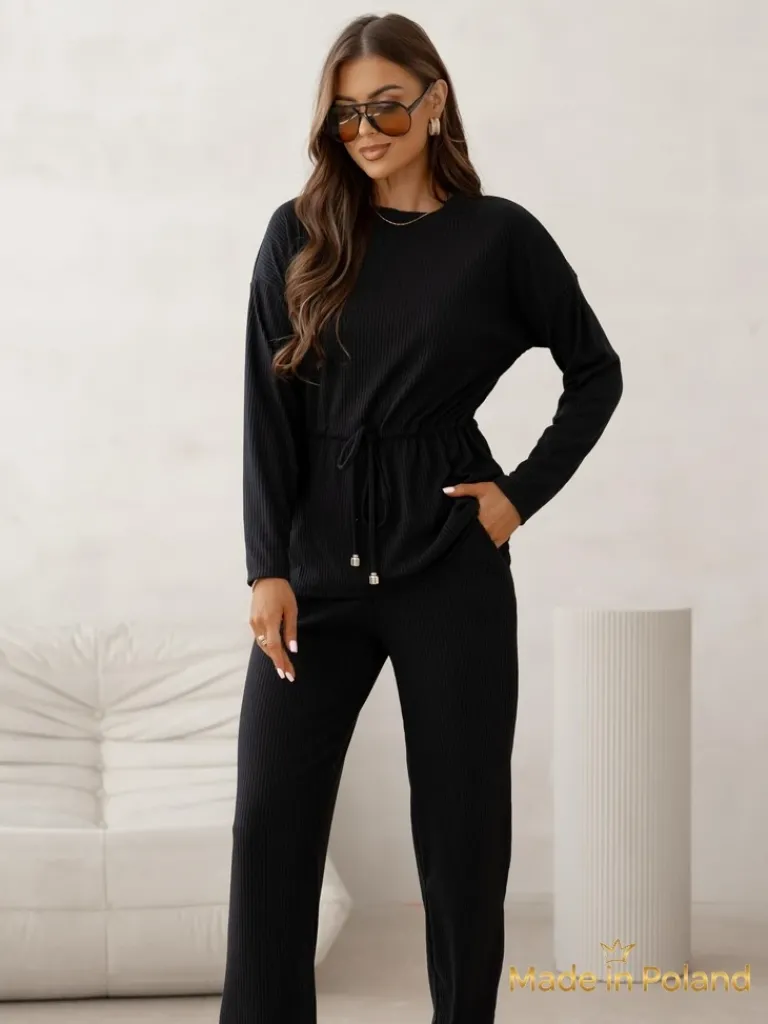 - Bawełniany Damski komplet a’la sweterkowy prążkowany Góra z długim rękawem i ściągaczem w pasie. Spodnie poszerzane z gumką w pasie i kieszeniami. Poczuj styl w tym wspaniałym komplecie!
