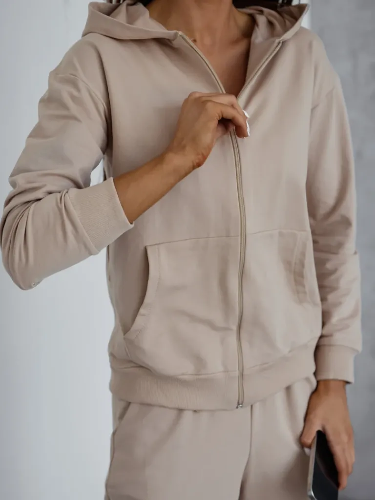 - Damski komplet dresowy wykonany z przyjemnego materiału bawełnianego. Bluza zapinana na suwak z kapturem i kieszeniami. Długie spodnie z gumą w pasie i na nogawkach, z 2 kieszeniami. Poczuj styl w tym wspaniałym komplecie!