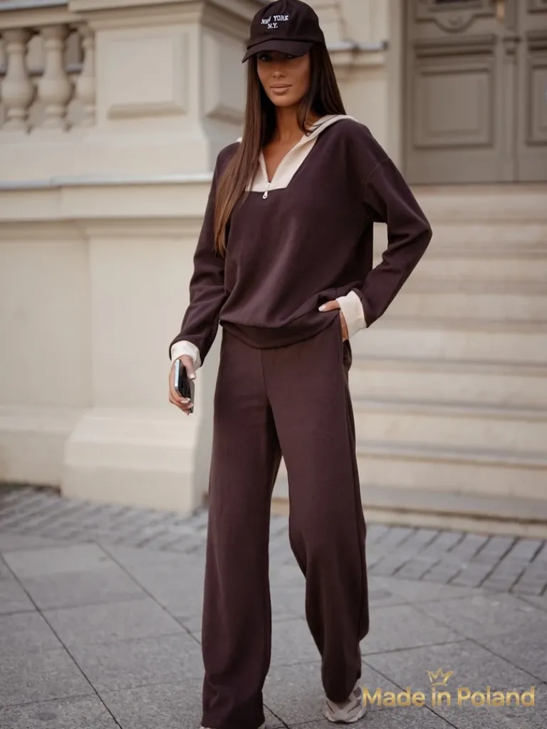 - Damski komplet sweterkowy wykonany z przyjemnego materiału bawełnianego. Bluza z suwakiem przy dekolcie. Długie spodnie z gumą w pasie z 2 kieszeniami. Poczuj styl w tym wspaniałym komplecie!