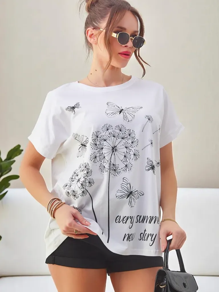 - Bawełniany damski t-shirt z delikatnym motywem dmuchawców i motylka, łączący lekkość z urokiem natury. Idealny na co dzień, dodaje świeżości i subtelnego uroku każdej stylizacji.