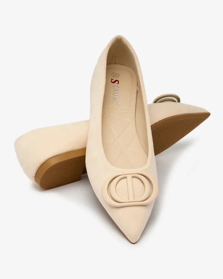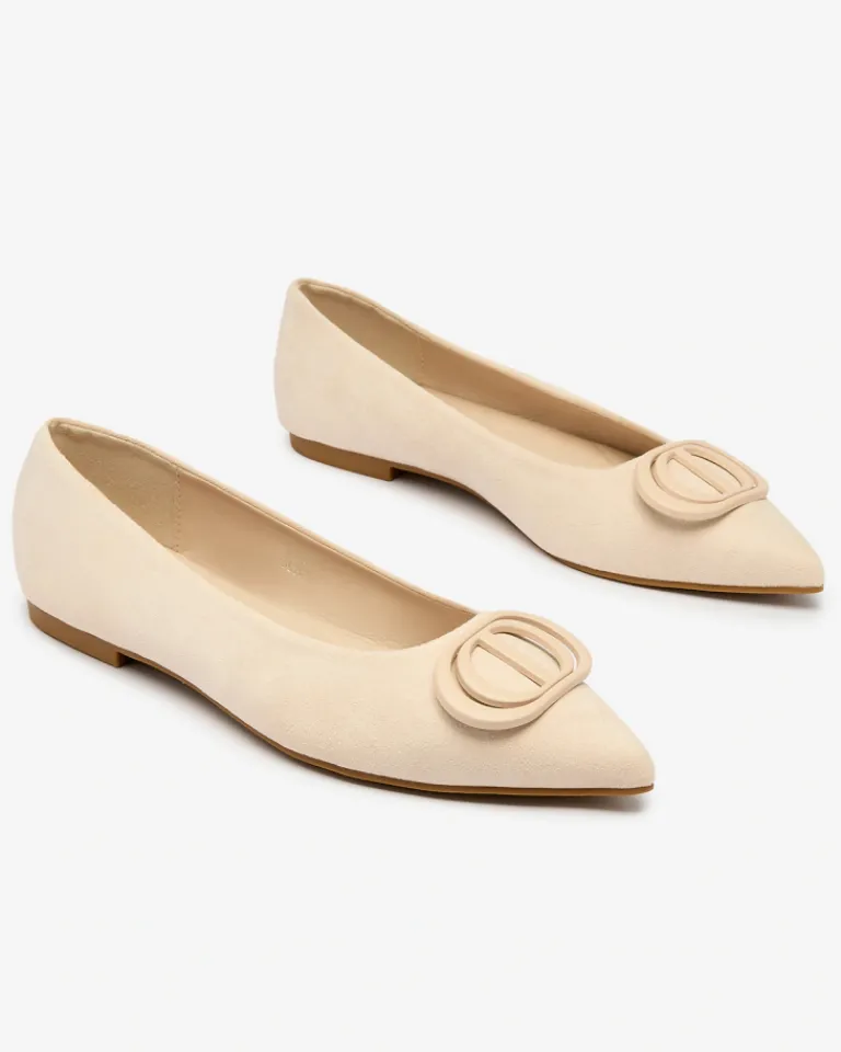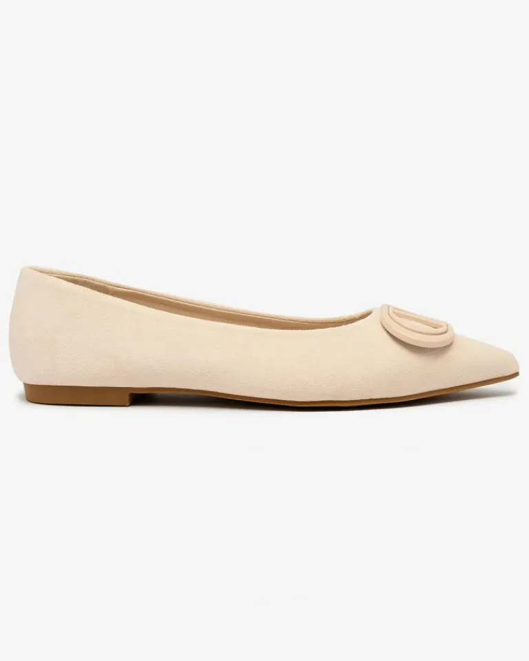 - Balerinki damskie na płaskim obcasie w całości wykonane ze skóry ekologicznej zamszowej. Nosek w szpic i zdobiony metalową klamrą. Super dodatek do Twoich casualowych outfitów!
