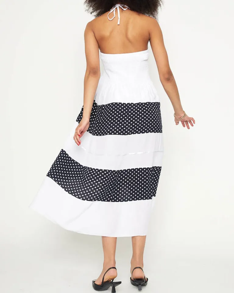 - Sukienka damska wykonana z połączenia materiału bawełnianego i poliestrowego. Model z podszewką, elastyczną górą i wiązaniem. UWAGA: Dokładność pomiaru (+/-) 1 cm.