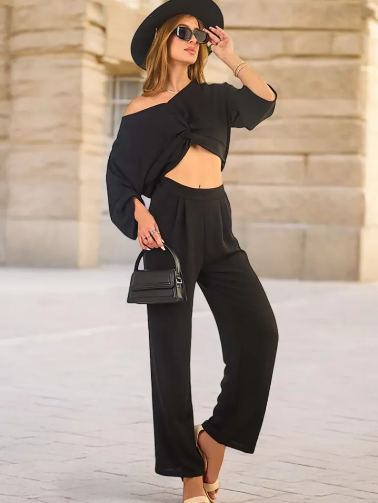 - Casualowy damski komplet wykonany z przyjemnego materiału. Krótka bluzka z rękawami 3/4 i ozdobnym pleceniem. Długie, szerokie spodnie z gumą w pasie, 2 kieszeniami. Poczuj wiosnę w tym wspaniałym komplecie!