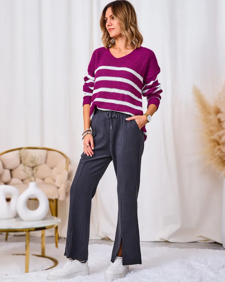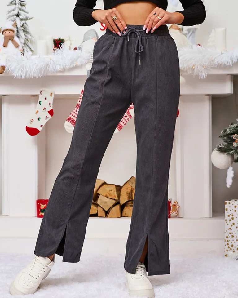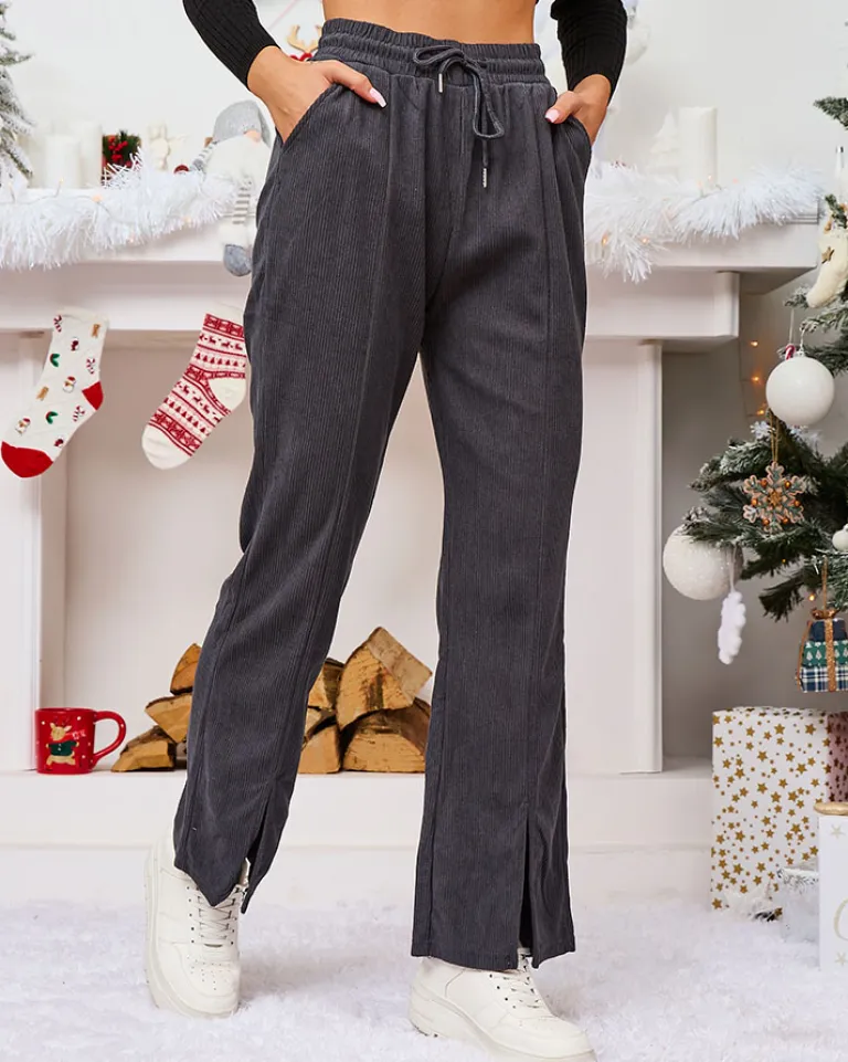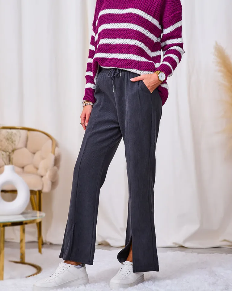 - Rewelacyjne szerokie spodnie damskie z materiału typu sztruks. Model posiada elastyczną gumę w pasie z regulowanymi troczkami. Dodatkowo, dwie wsuwane kieszenie z przodu. Hit tego sezonu!