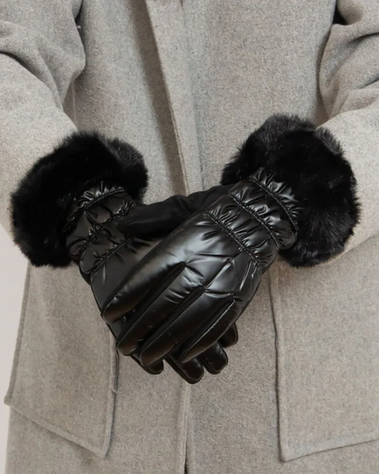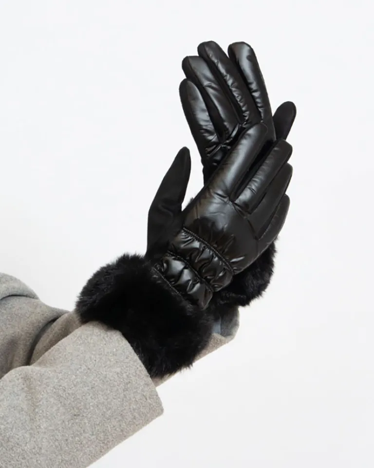 - Cieplutkie rękawiczki wykonane z materiału a’la cerata, po wewnętrznej stronie pokryte eko-zamszem. Wewnątrz miękka, futrzana podszewka, w dolnej części również futerko. Idealne na mroźne dni!