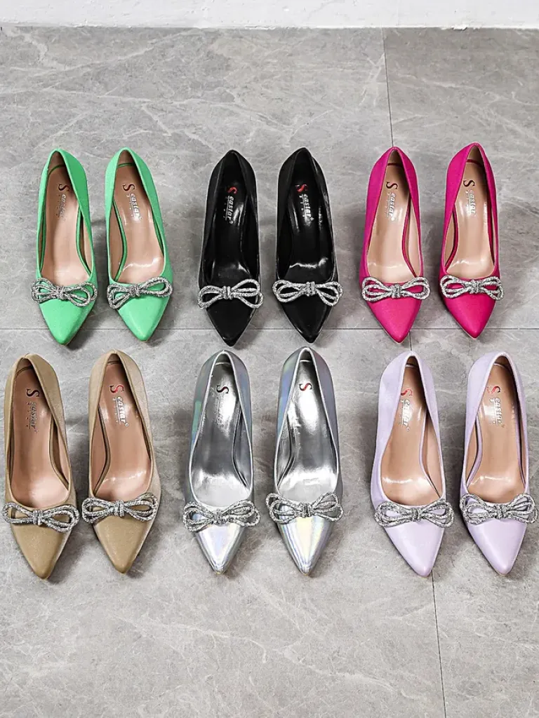- Czółenka damskie na słupku. Model pokryty tkaniną a’la satyna i posiada wkładkę ze skóry ekologicznej. Nosek w szpic z kokardką nadaje im zmysłowej elegancji. Załóż je do eleganckiej sukienki!