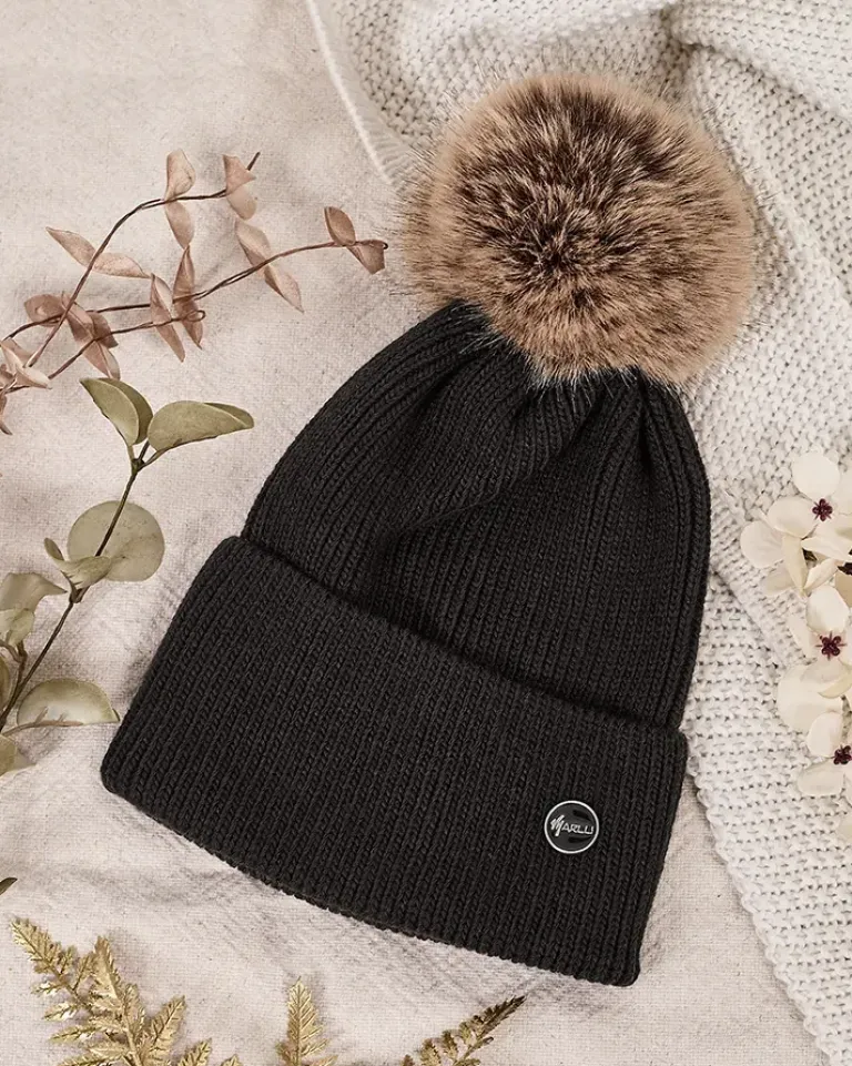 - Przepiękna damska czapka zimowa, wykonana z dzianiny. Model zdobiony puszystym pomponem. Idealna na chłodne i zimowe dni!