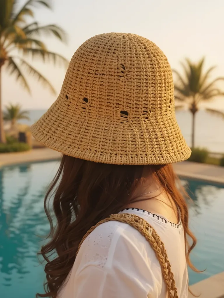 - Sunny Bucket to stylowy, tkaninowy kapelusz typu bucket, pleciony na wzór słomy. Lekki i przewiewny – idealny dodatek na lato, chroniący przed słońcem z nutą luzu.