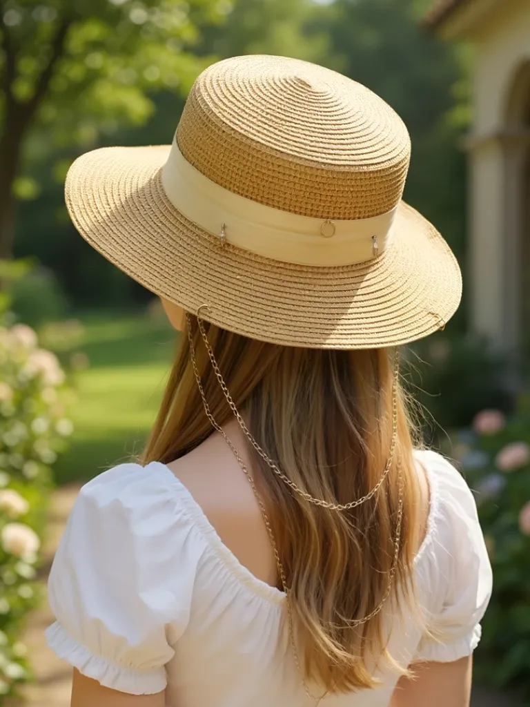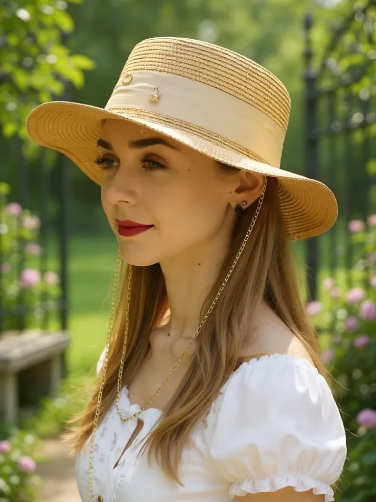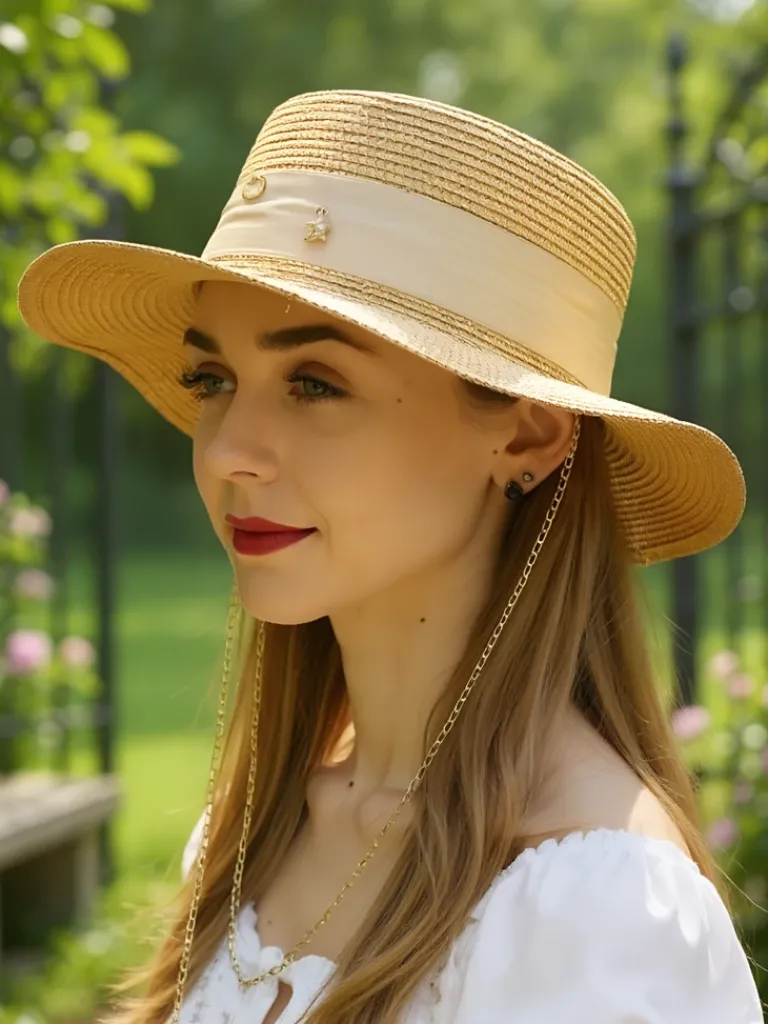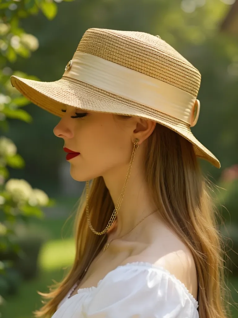 - Elegancki kapelusz ze sztywnym rondem i ozdobną wstążką. Idealny do letnich stylizacji – szyk, klasa i ochrona przed słońcem w jednym.