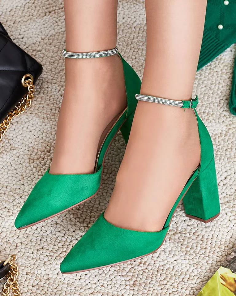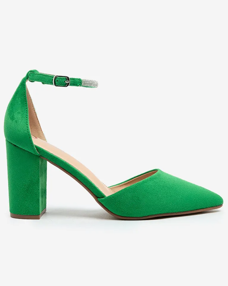 - Przepiękne damskie czółenka na słupku – połączenie klasyki i elegancji z wygodą! Para wykonana jest ze skóry ekologicznej zamszowej. Wkładka eko-skórzana, model zapinany na pasek przy kostce, nosek w szpic. Must have w szafie każdej kobiety!