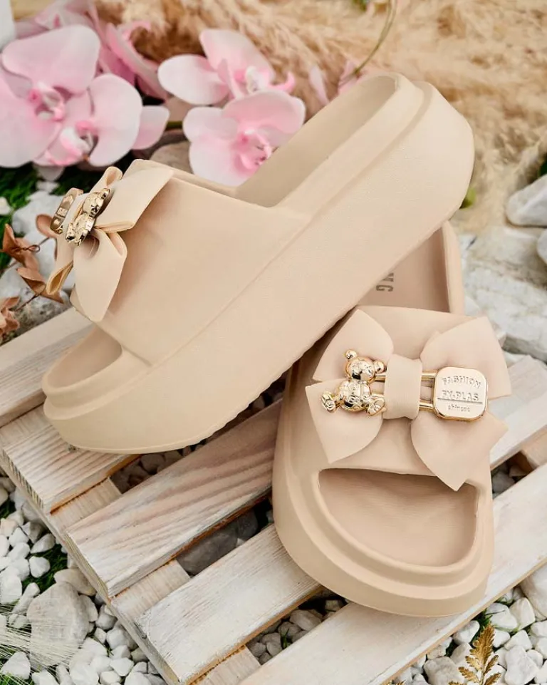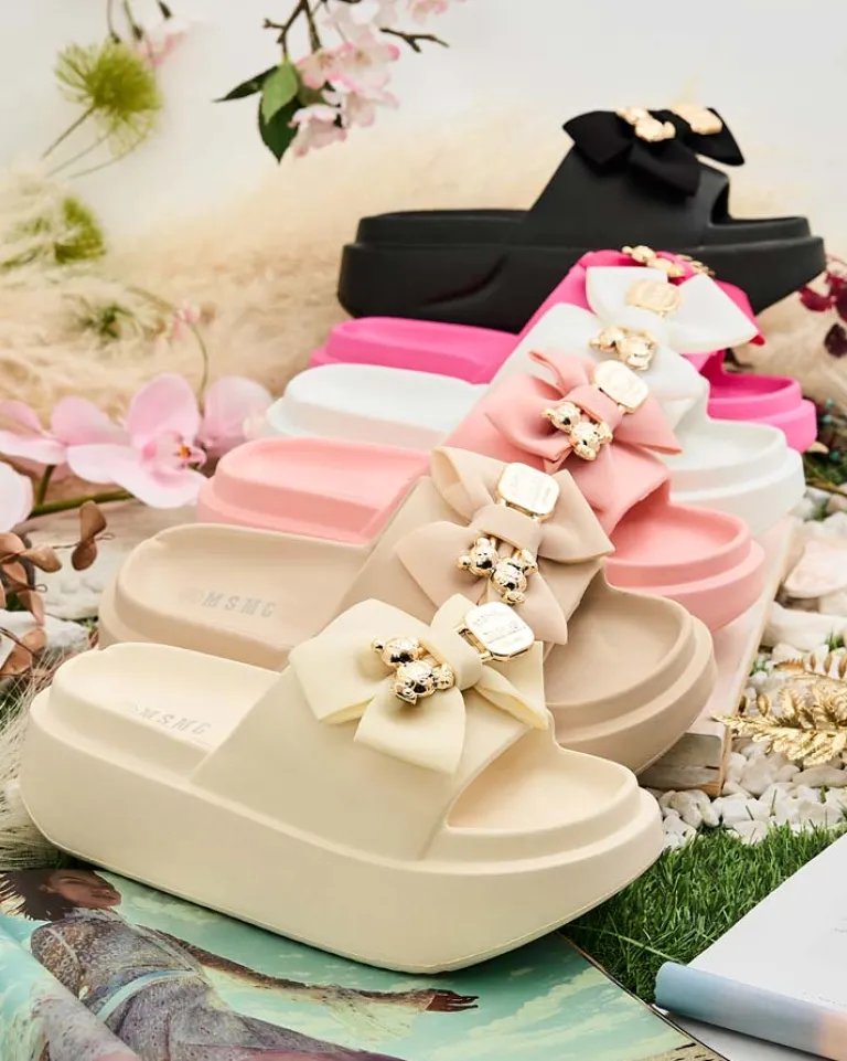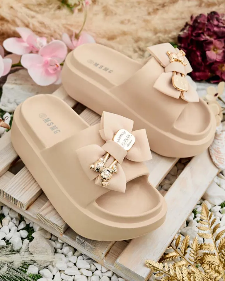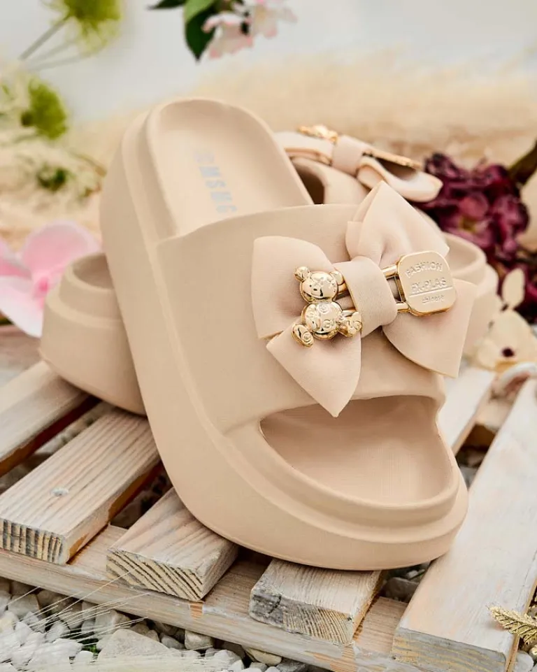 - Świetne damskie gumowe klapki na platformie. Posiadają na cholewce ozdobną kokardę. Idealny wybór na wakacje!