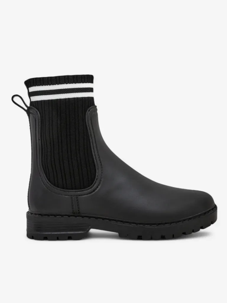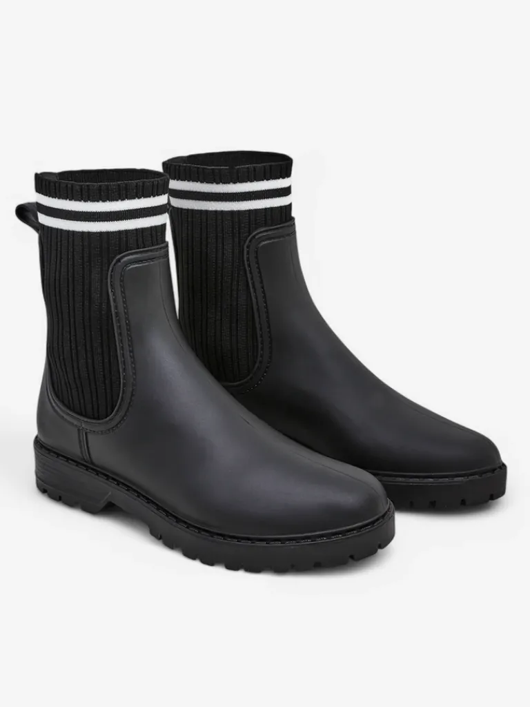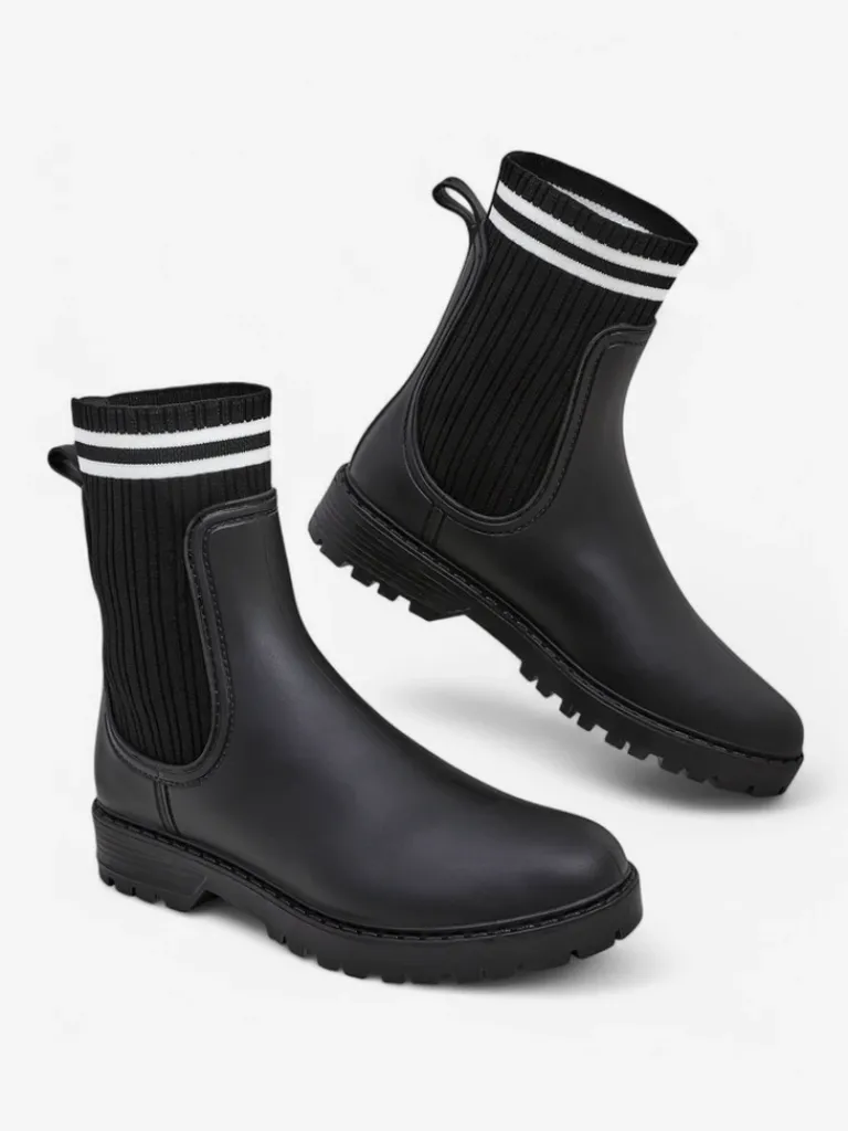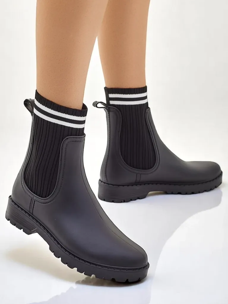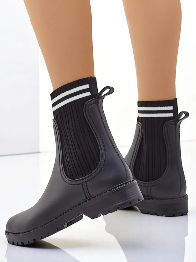 - Klasyczne damskie kalosze na płaskim obcasie, wykonane z materiału gumowego oraz wyższej, tkaninowej wstawki a 'la skarpetka. W środku wkładka z tkaniny. Idealne na wiosenne deszczowe dni!