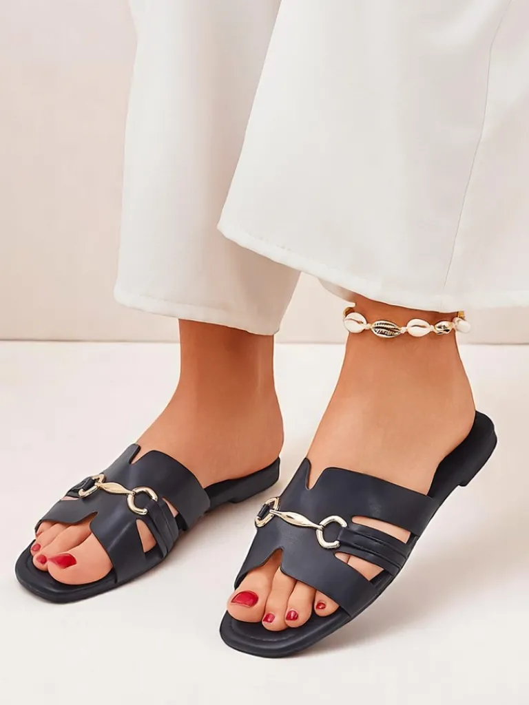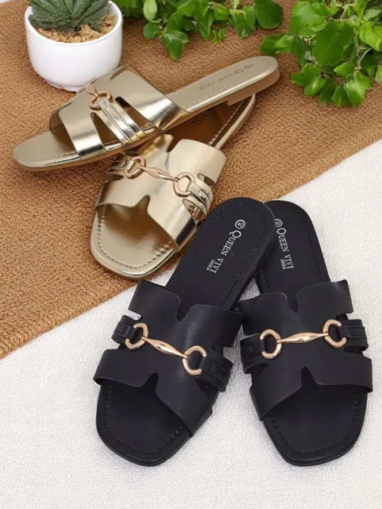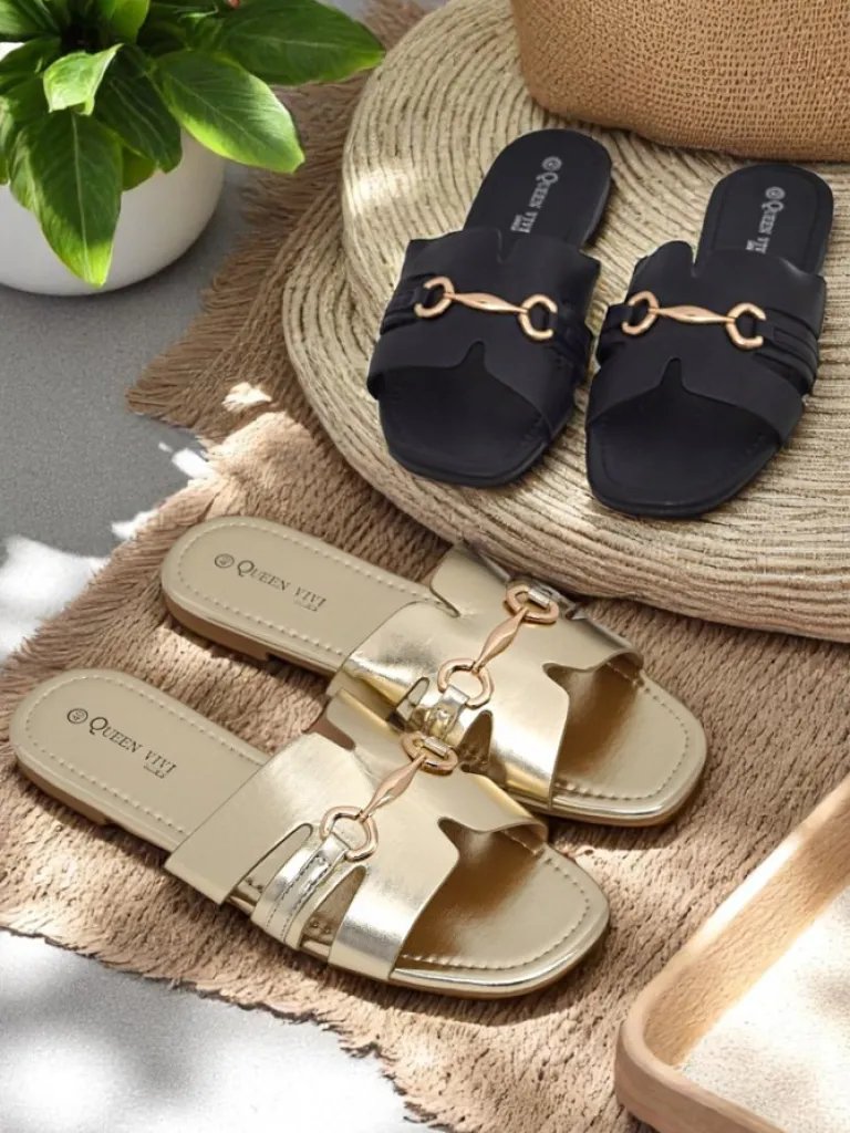 - Klapki z ekologicznej skóry, ozdobione subtelną złotą ozdobą. Elegancka prostota i komfort, które pasują do każdej letniej stylizacji.